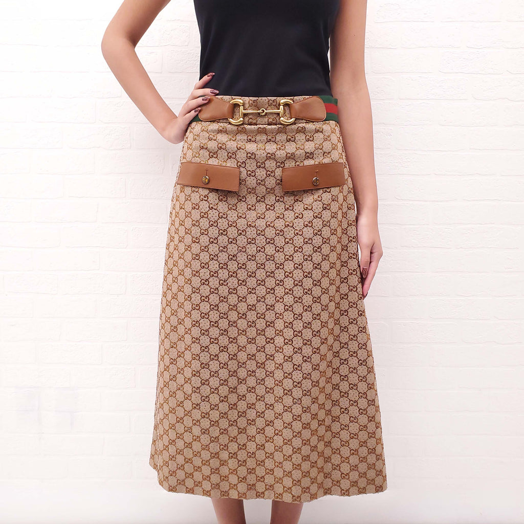 GUCCI MONOGRAM 'ARIA' CRYSTAL EMBELLISHED SKIRT WITH LEATHER AND HORSEBIT DETAIL - SIZE 44
