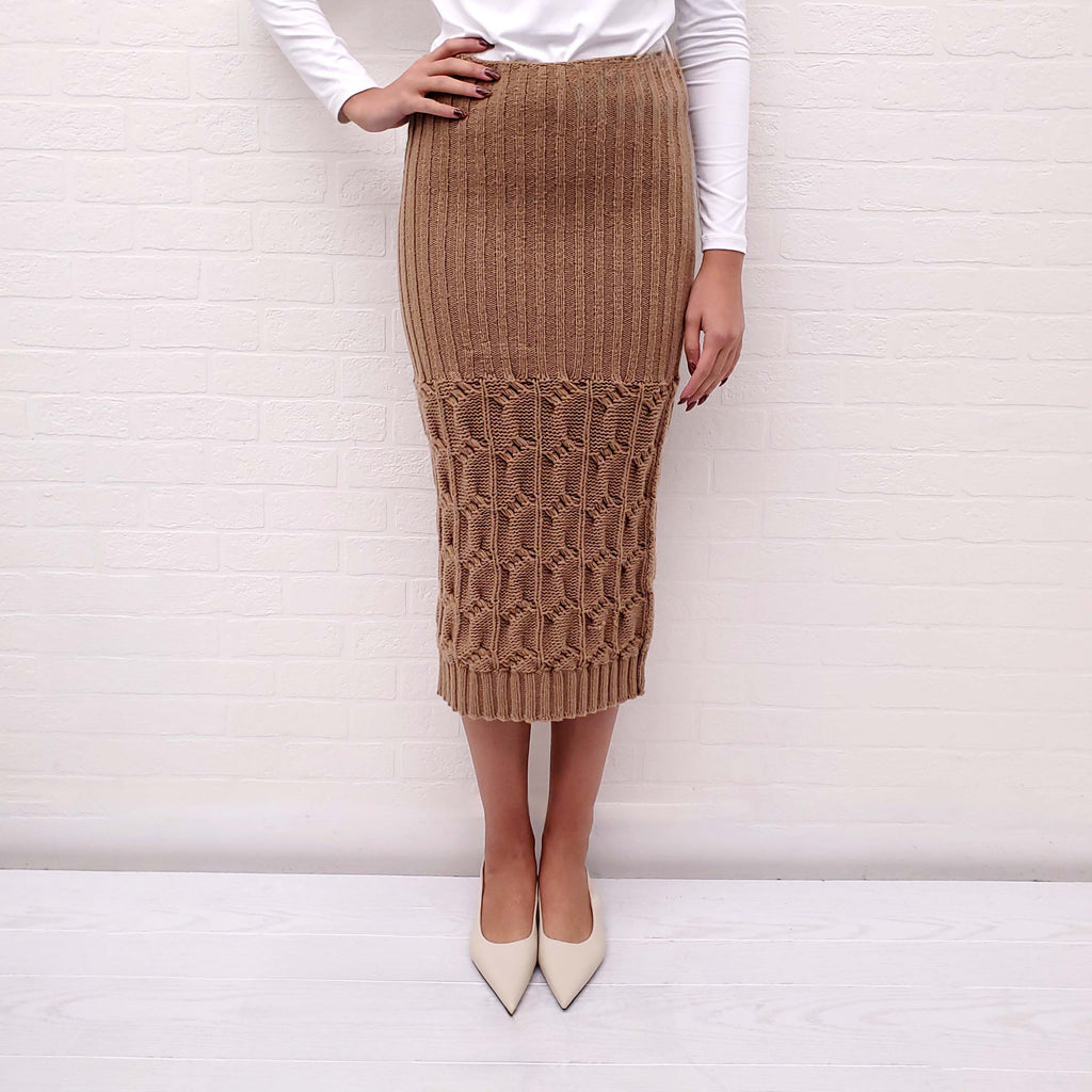 MAX MARA CAMEL CABLE KNIT WOOL AND CASHMERE PENCIL SKIRT - SIZE M