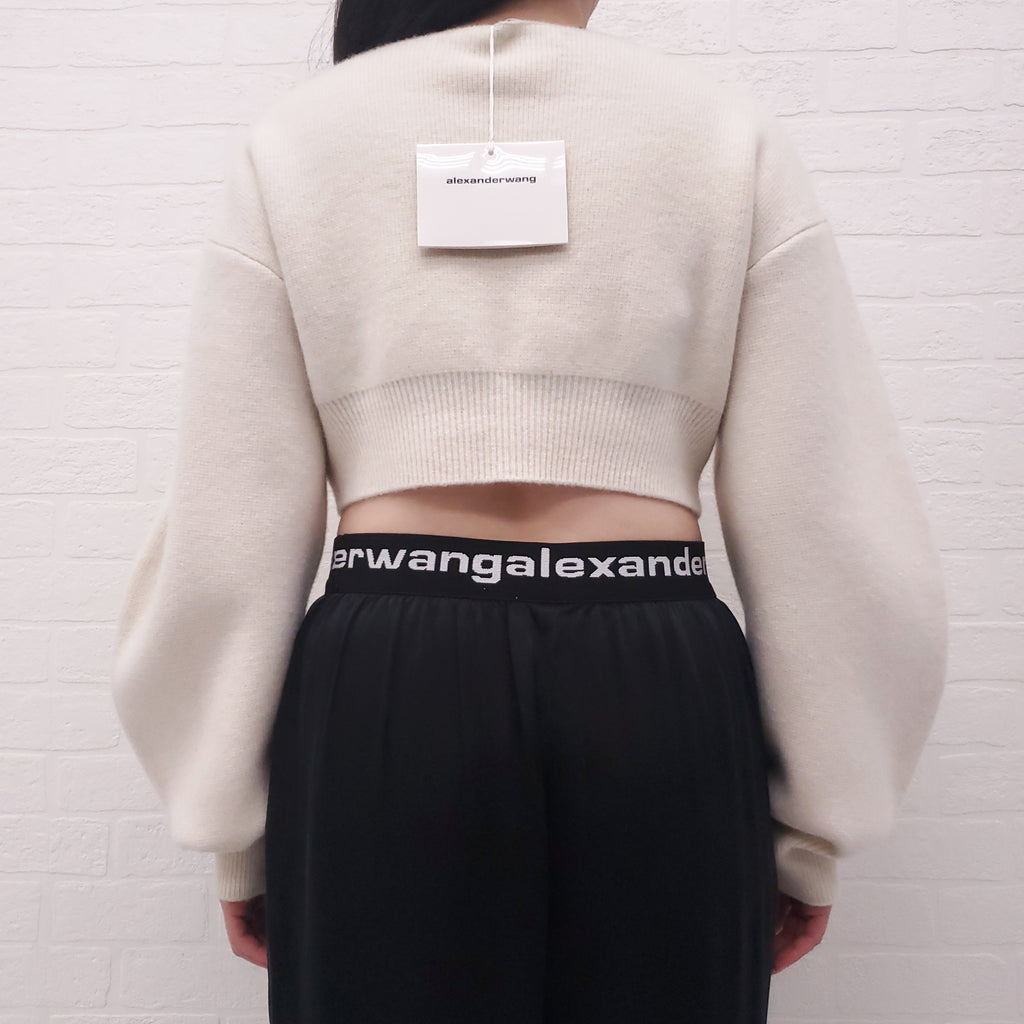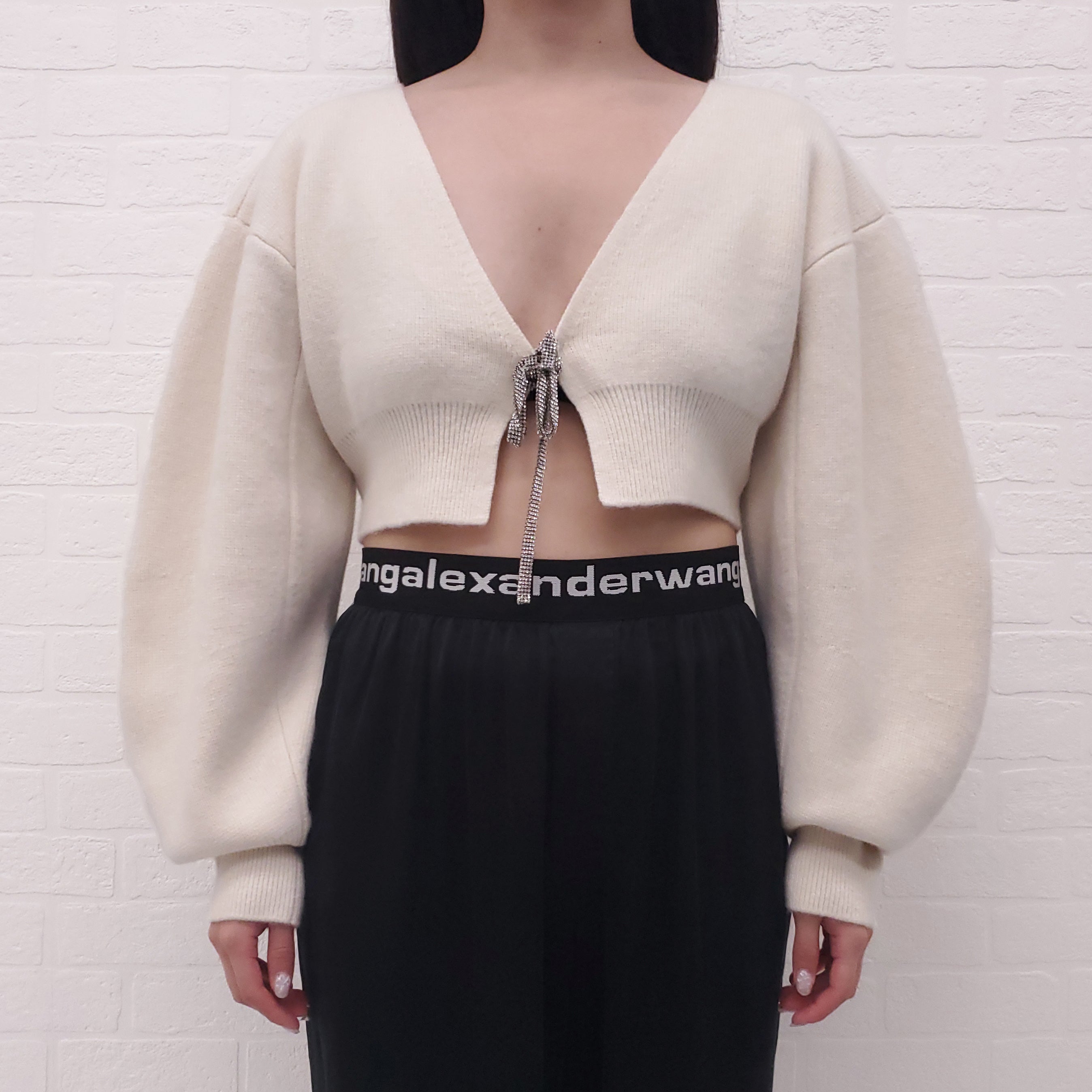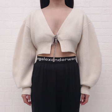 ALEXANDER WANG CREAM V-NECK CROPPED CARDIGAN WITH CRYSTAL BOW - SIZE L