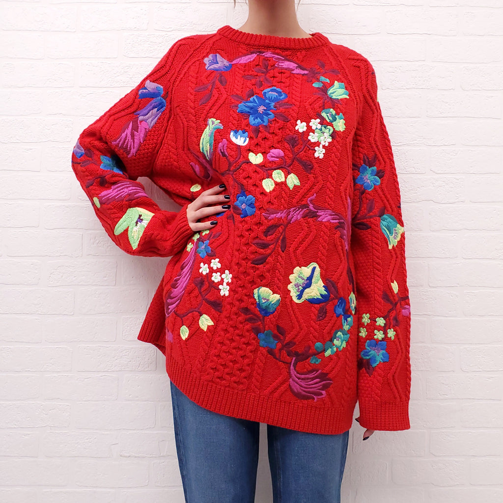 VERSACE RED CABLE KNIT FLORAL EMBROIDERED SWEATER - SIZE 38