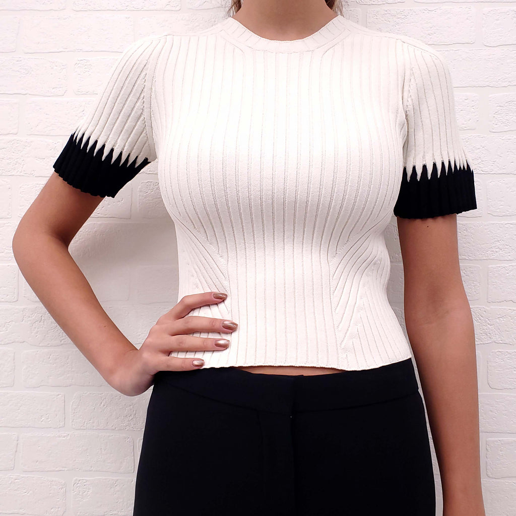ALEXANDER MCQUEEN CREAM AND BLACK RIBBED SHORT SLEEVE SWEATER - SIZE S