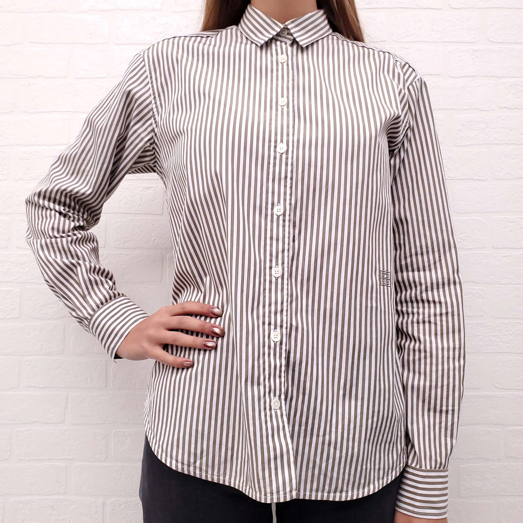 TOTEME KHAKI AND WHITE STRIPED BUTTON UP BLOUSE WITH LOGO - SIZE S