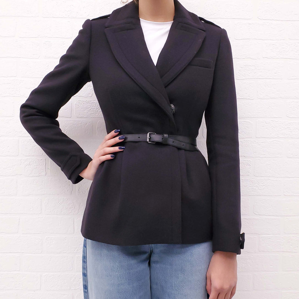 BURBERRY BRIT NAVY JACKET WITH BLACK LEATHER BELT DETAIL - SIZE 2