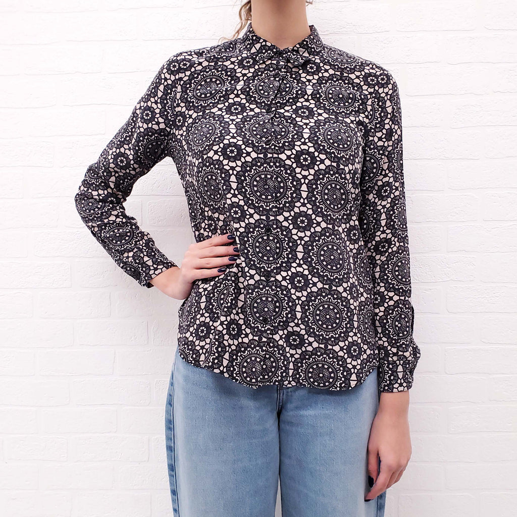 BURBERRY CREAM AND BLACK SILK PATTERNED BLOUSE - SIZE 6