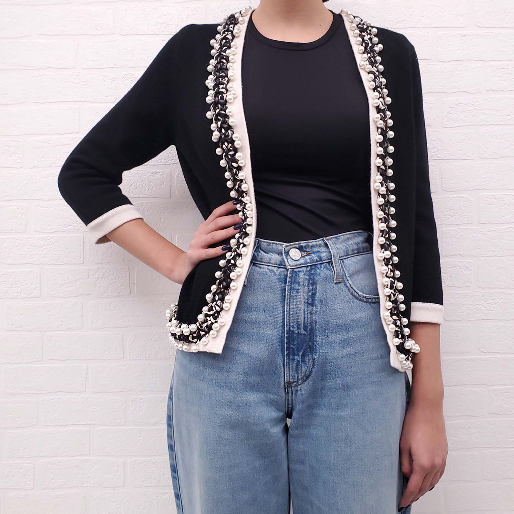CHANEL BLACK CASHMERE SWEATER WITH WOVEN PEARL DETAIL - SIZE 38
