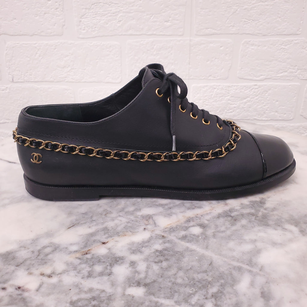 CHANEL BLACK LEATHER OXFORDS WITH CHAIN DETAIL - SIZE 37.5