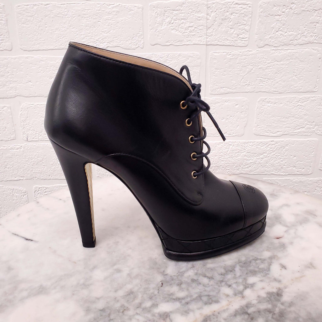 CHANEL BLACK LEATHER PLATFORM BOOTIES WITH QUILTED HEEL DETAIL - SIZE 39