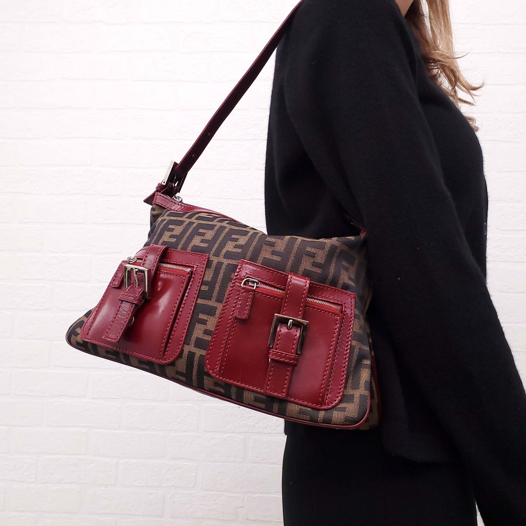 FENDI ZUCCA SHOULDER BAG WITH RED LEATHER POCKETS