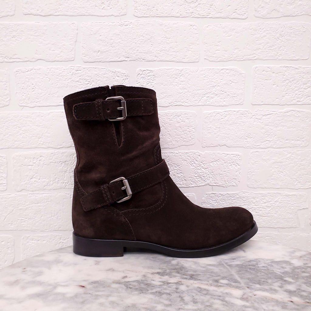 PRADA BROWN SUEDE LEATHER BUCKLE MOTO BOOTS - SIZE 37.5