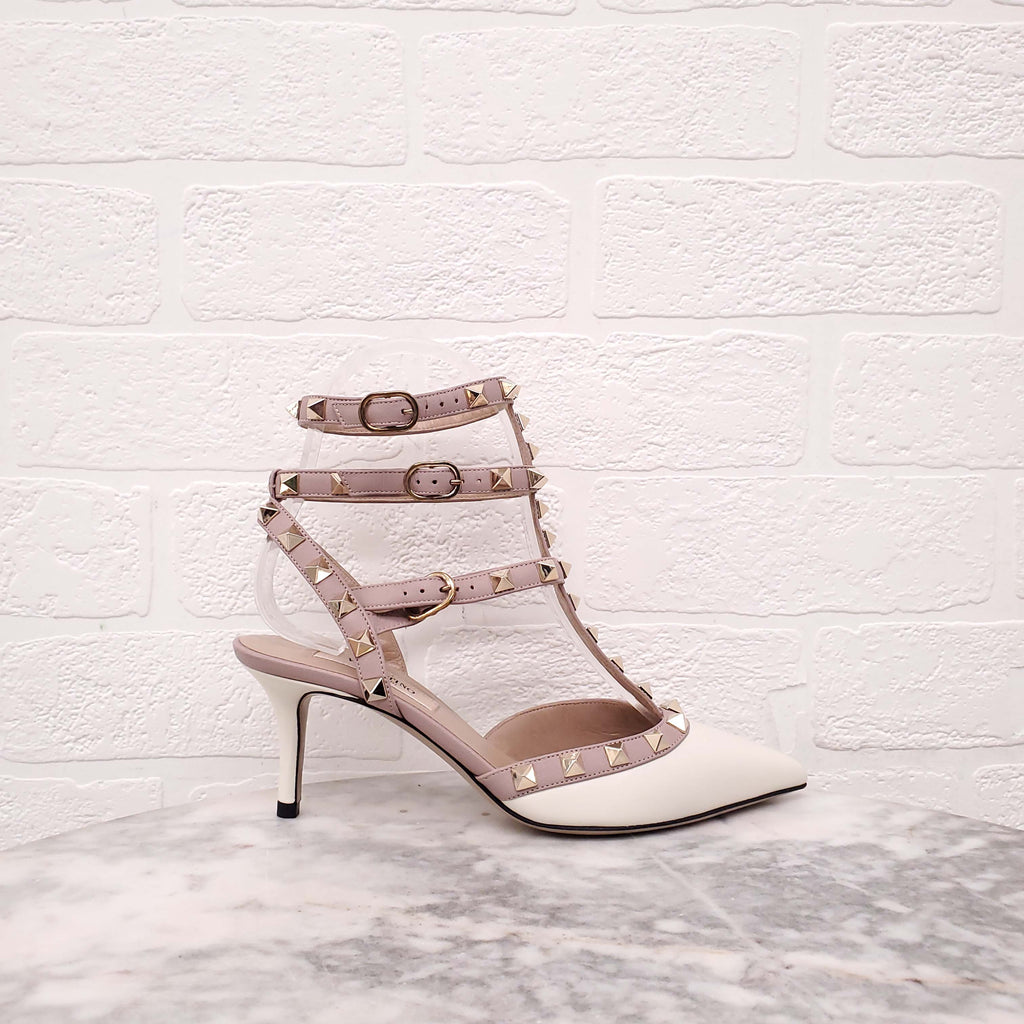 VALENTINO CREAM AND BLUSH ROCKSTUD ANKLE STRAP HEELS - SIZE 37