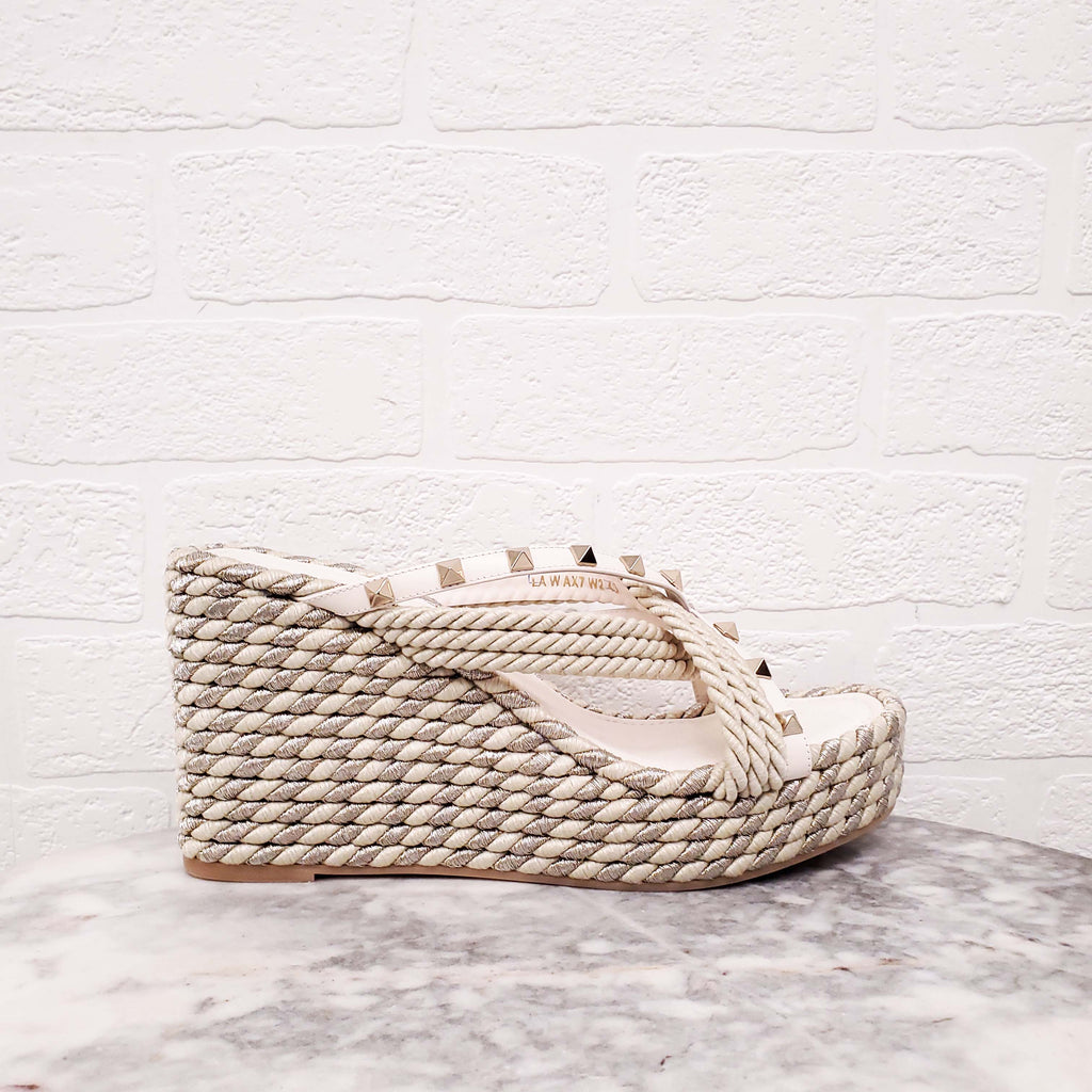 VALENTINO CREAM BRAIDED ROCKSTUD WEDGE ESPADRILLES - SIZE 40