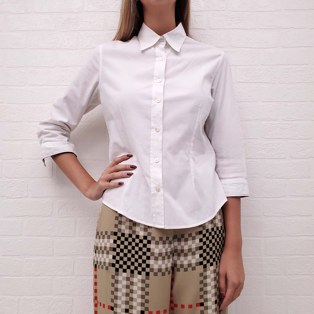BURBERRY WHITE COTTON THREE QUARTER LENGTH SLEEVE TOP WITH CHECK CUFFS - SIZE M