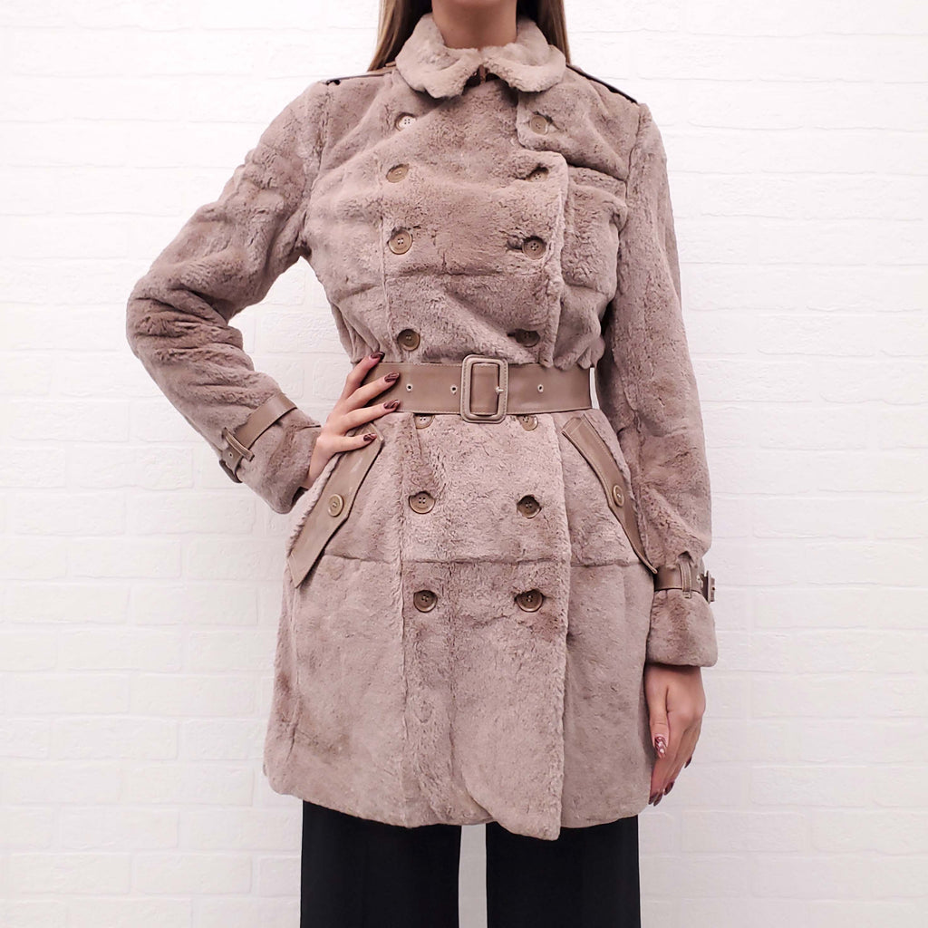 BURBERRY TAUPE RABBIT FUR AND LEATHER DOUBLE BREASTED COAT WITH BELT - SIZE 8