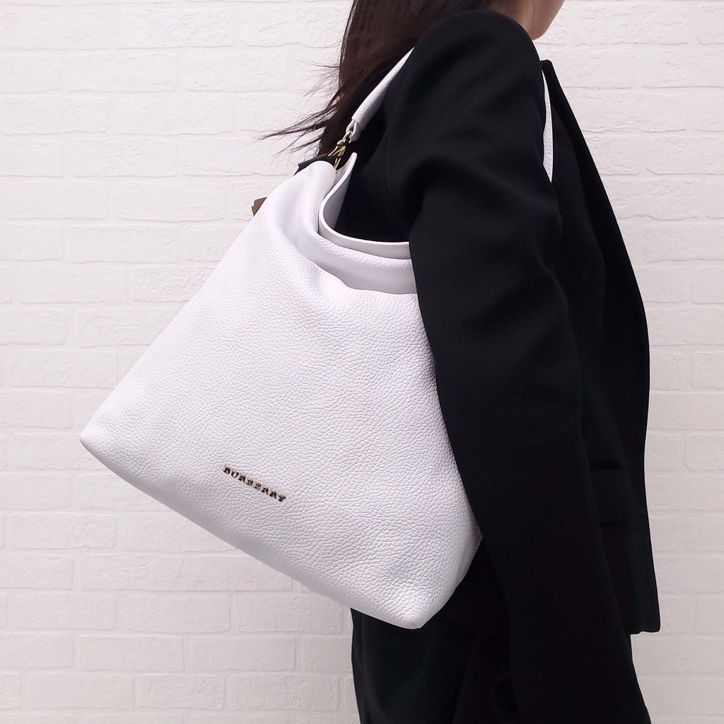 BURBERRY WHITE PEBBLED LEATHER HOBO BAG WITH CHECK INTERIOR