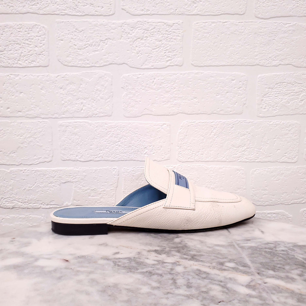 PRADA WHITE LEATHER LOGO SLIDES - SIZE 36