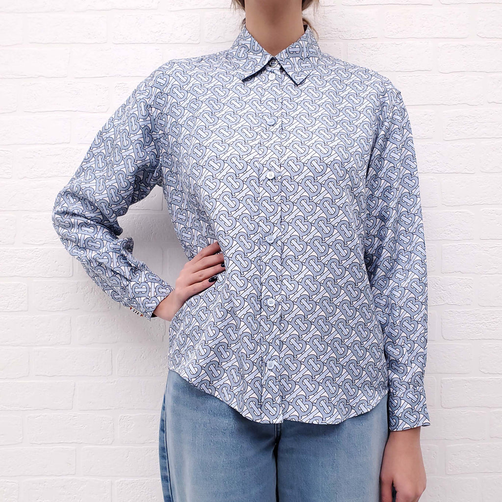 BURBERRY BLUE SILK LOGO PATTERNED BLOUSE - SIZE 2