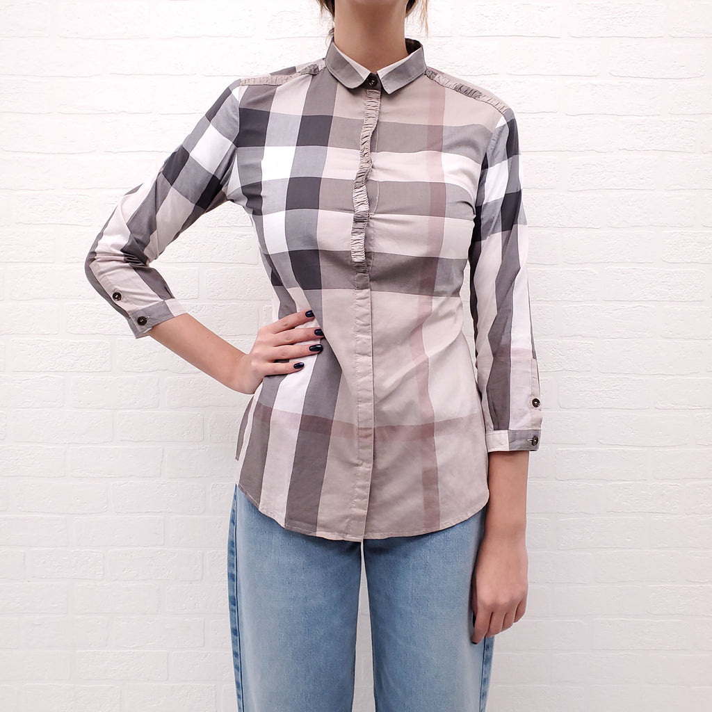 BURBERRY BRIT GREY AND NUDE CHECK BLOUSE - SIZE XS