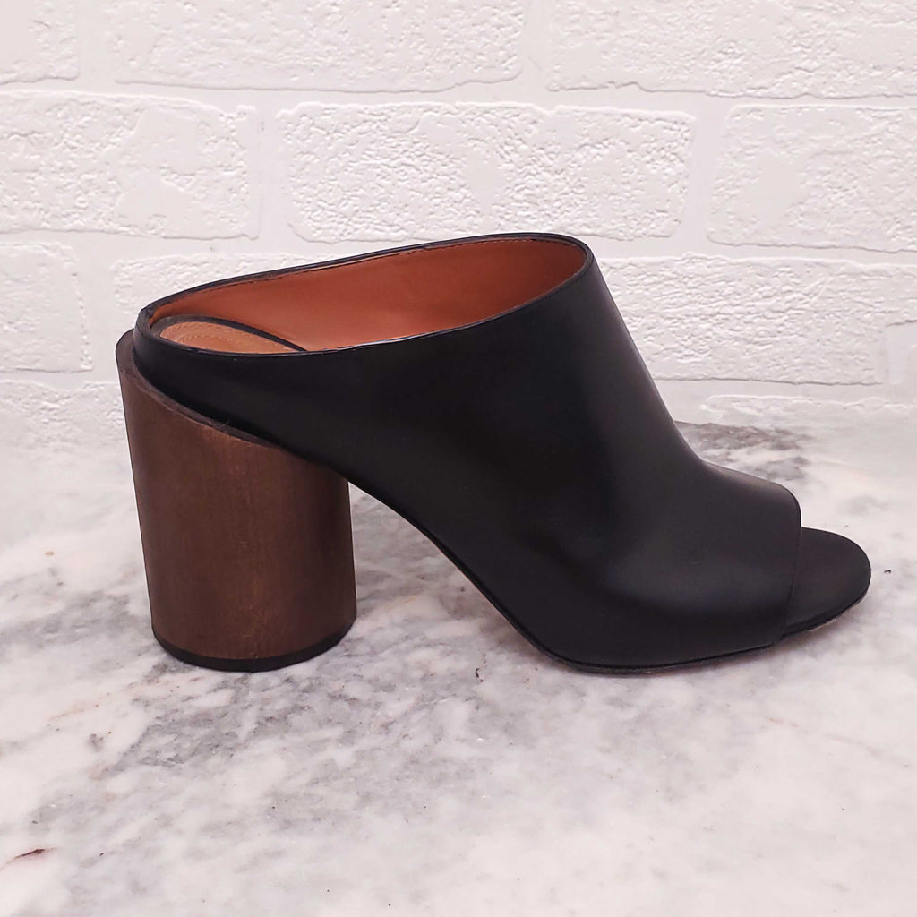 GIVENCHY BLACK LEATHER MULES WITH ROUND WOOD BLOCK HEEL - SIZE 40