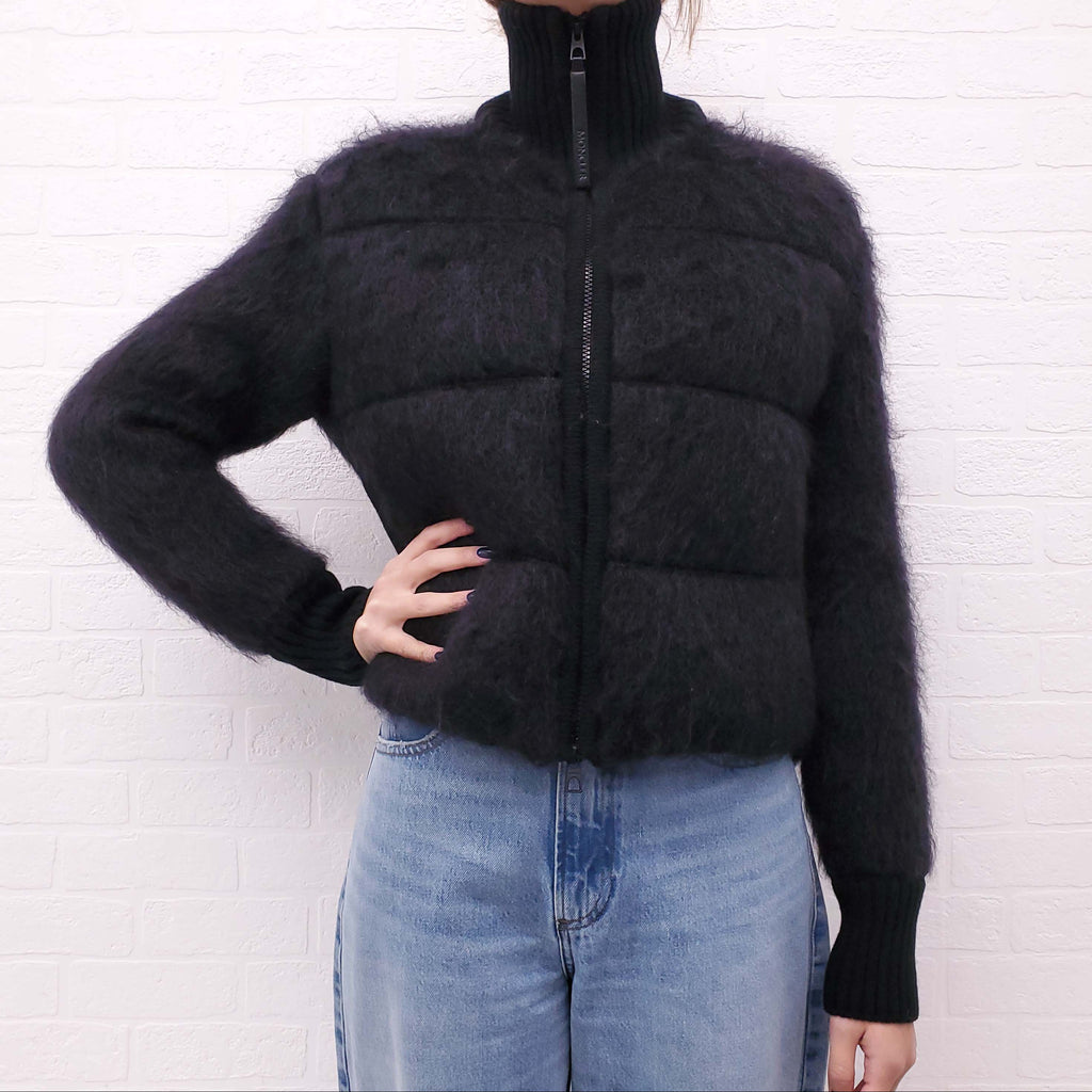MONCLER BLACK FUZZY BOMBER JACKET WITH LOGO - SIZE XS