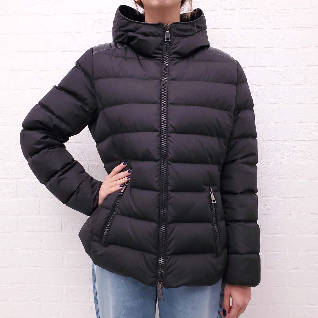 MONCLER BLACK PUFFER JACKET WITH LOGO AND LEATHER DETAIL - SIZE 5/XL