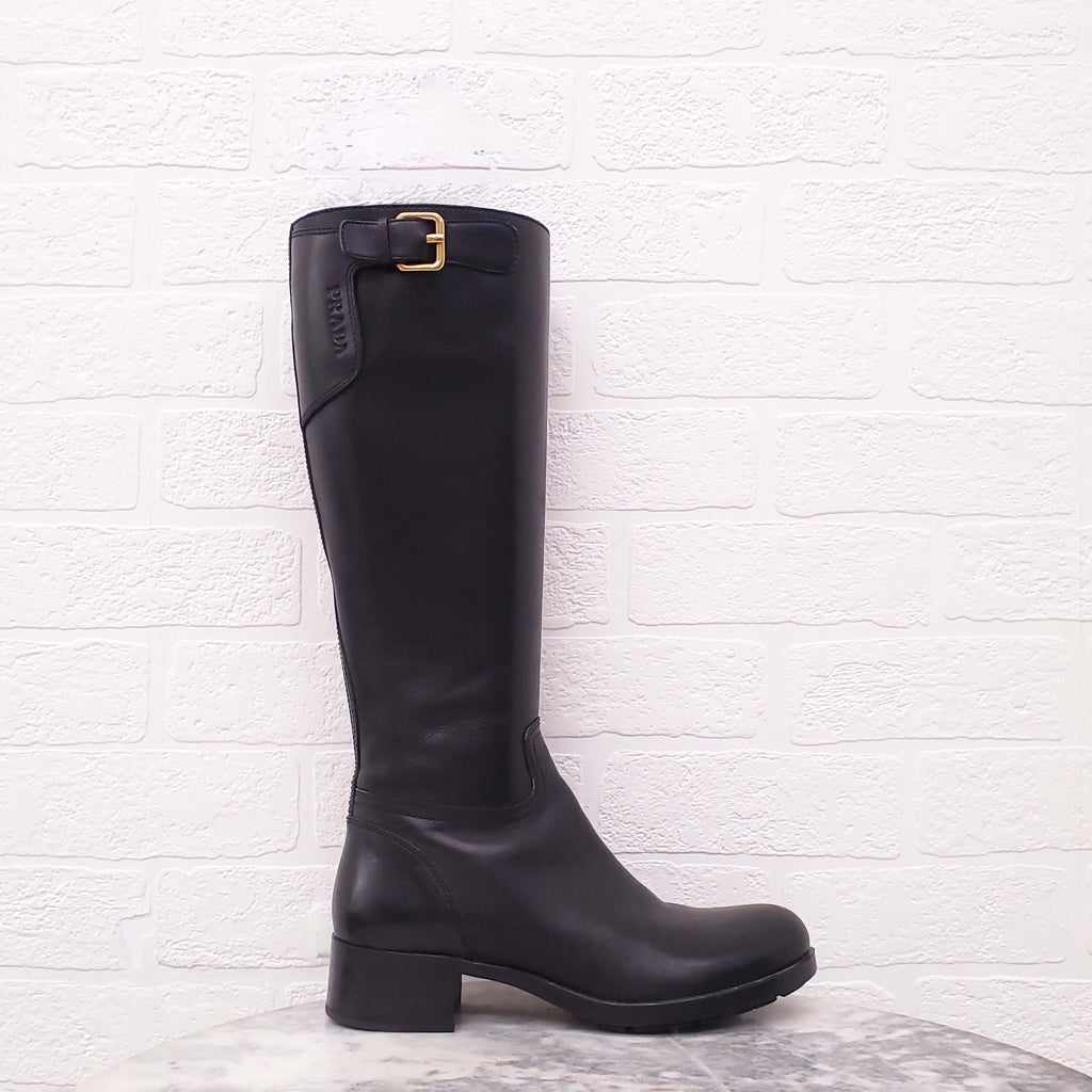 PRADA BLACK LEATHER RIDING BOOTS WITH LOGO AND ZIPPER - SIZE 36.5