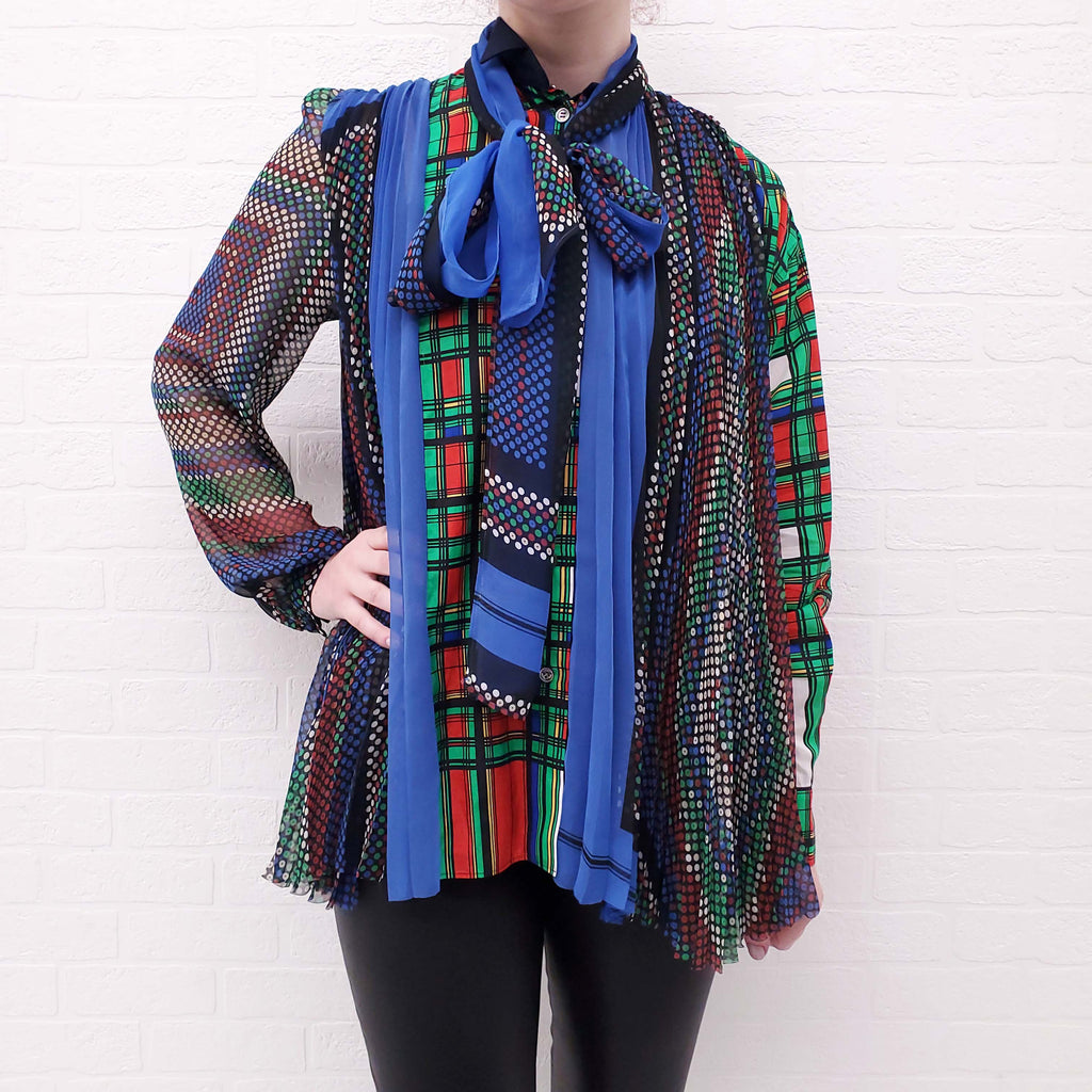 SACAI PLAID AND POLKA DOT PLEATED BLOUSE WITH TIE - SIZE 2/M