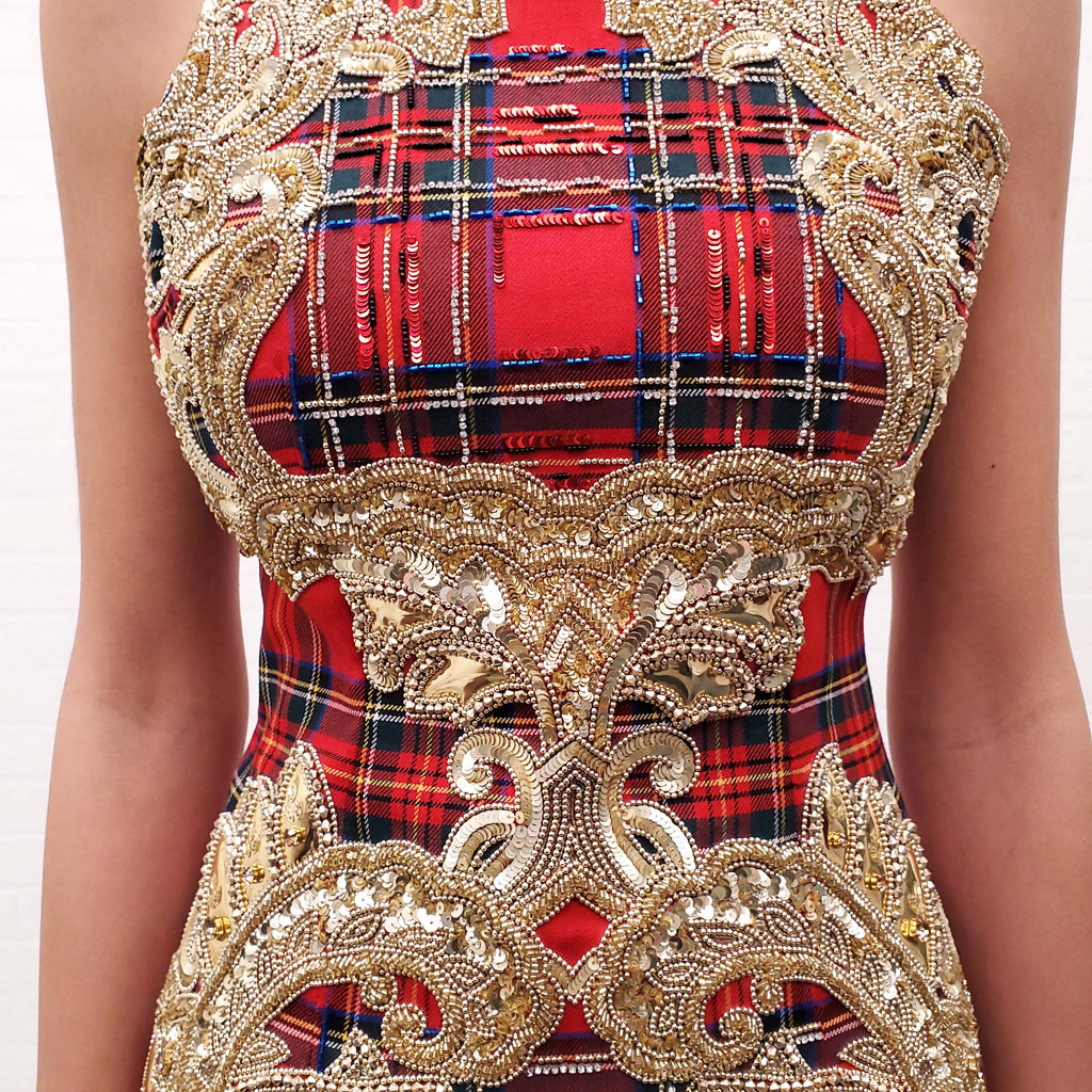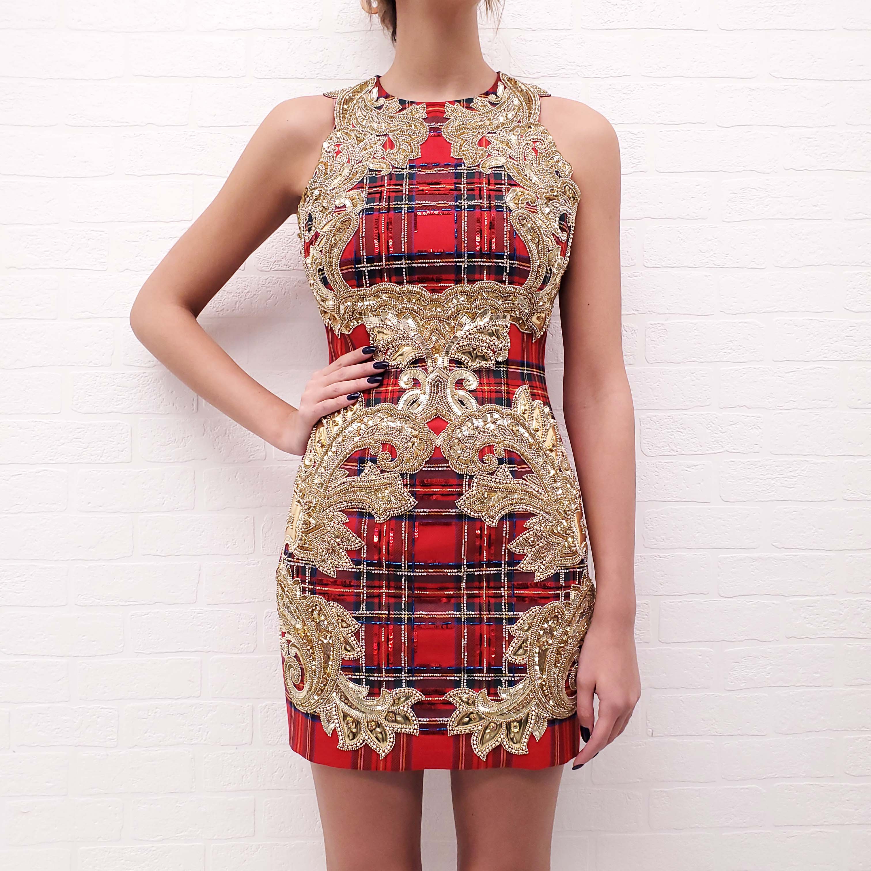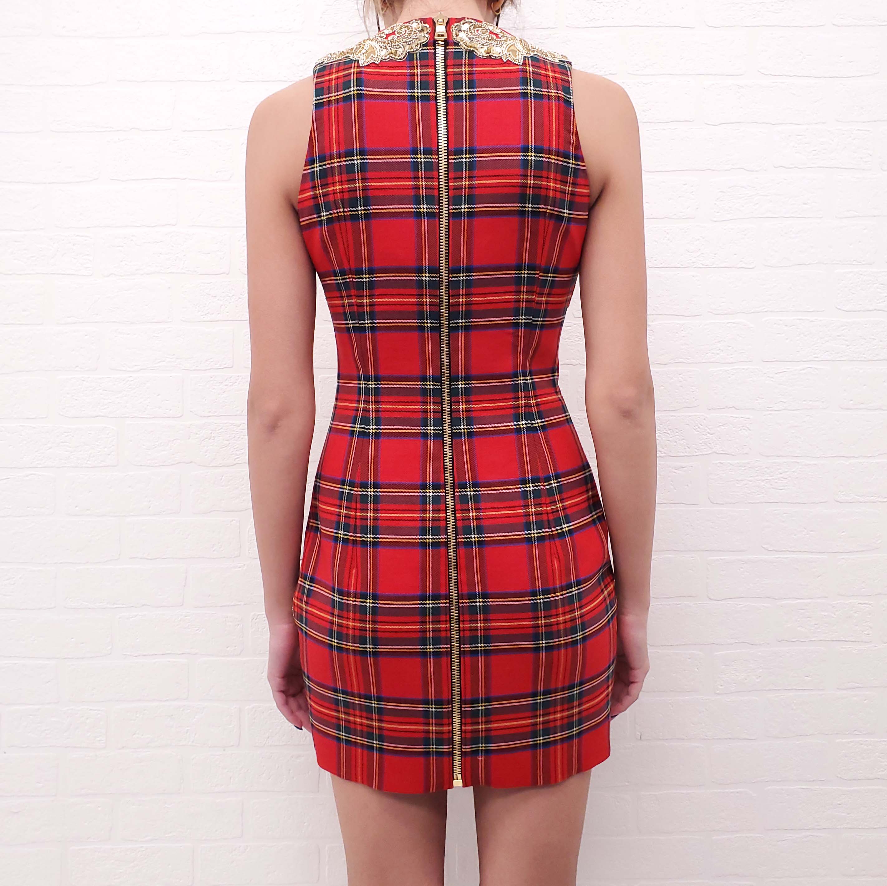 BALMAIN RUNWAY TARTAN WOOL DRESS WITH GOLD RHINESTONES - SIZE 36