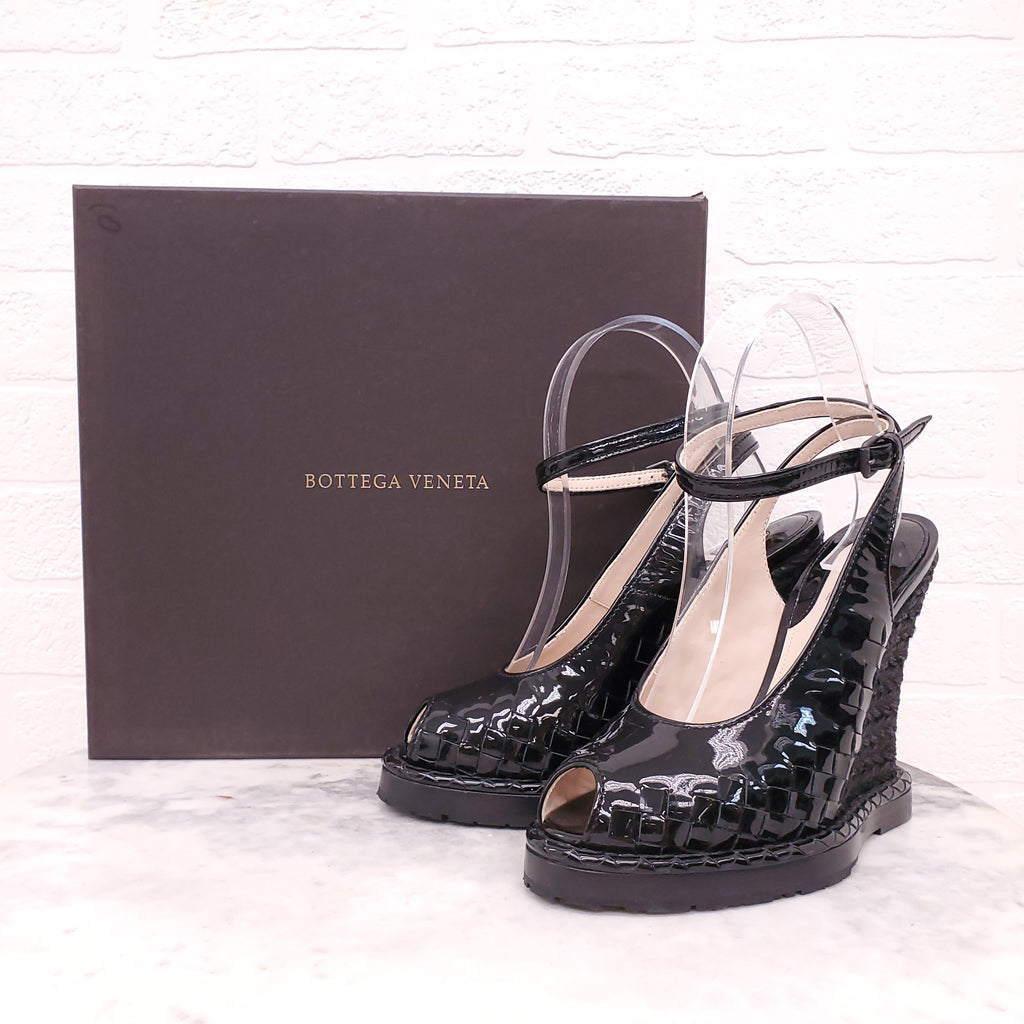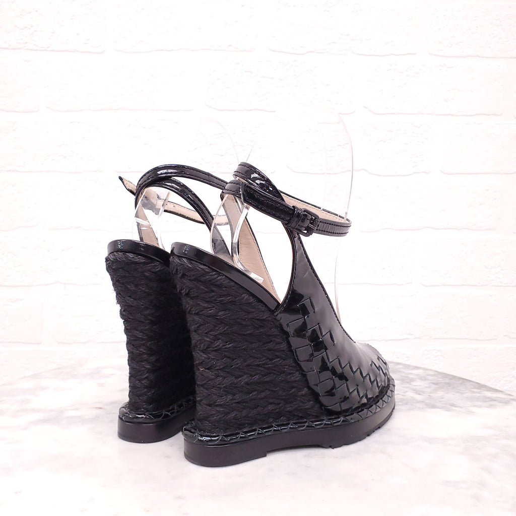 BOTTEGA VENETA BLACK PATENT STITCHED AND CORK WEDGE HEEL - SIZE 37