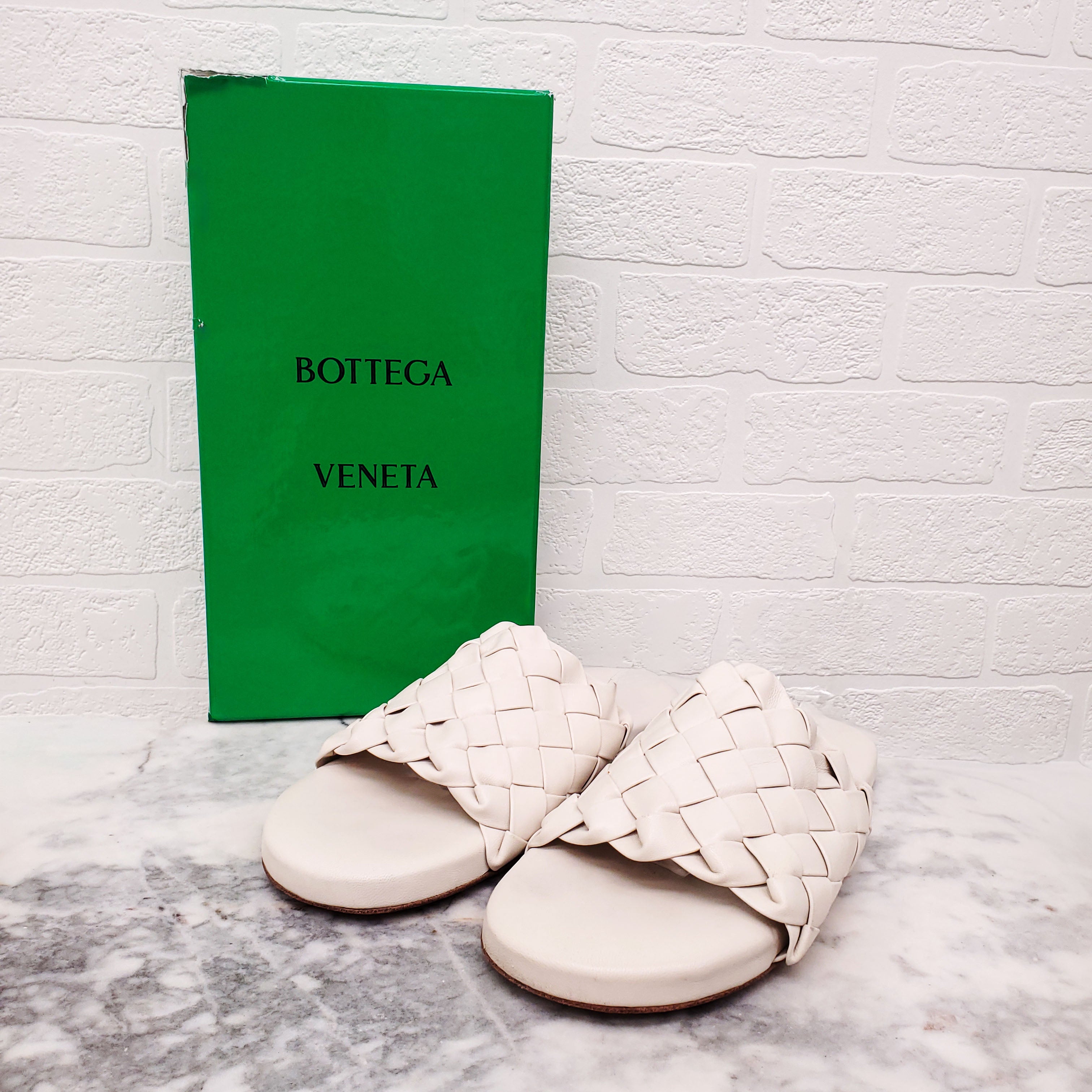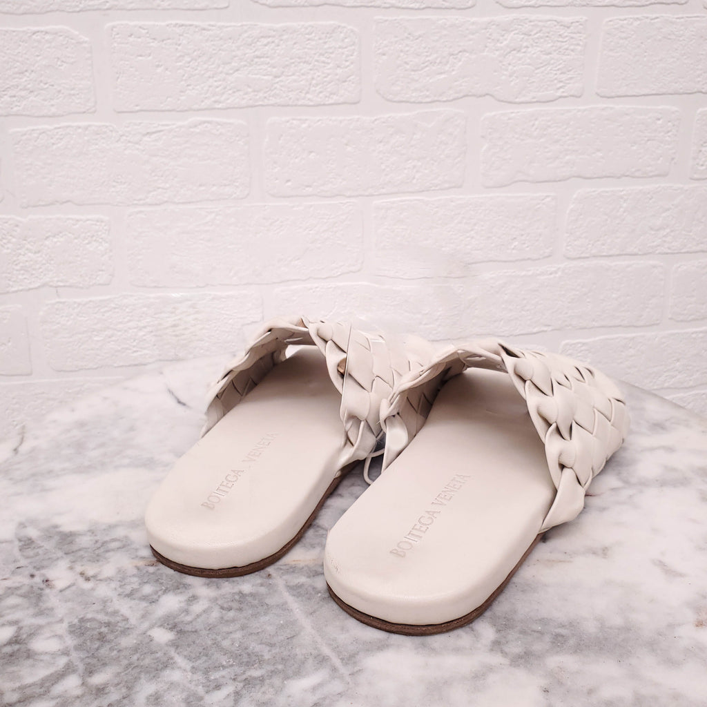 BOTTEGA VENETA CREAM WOVEN LEATHER SLIDES - SIZE 40