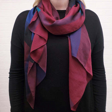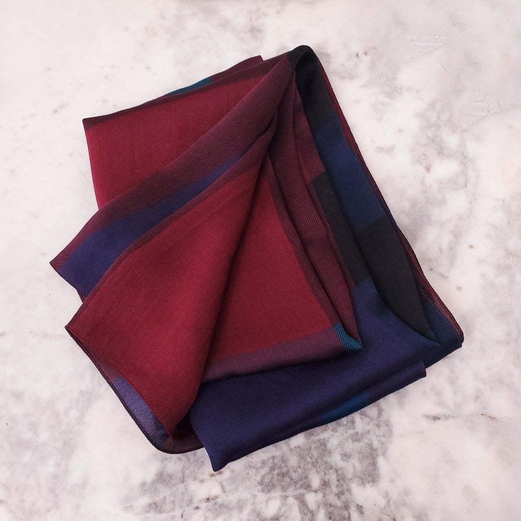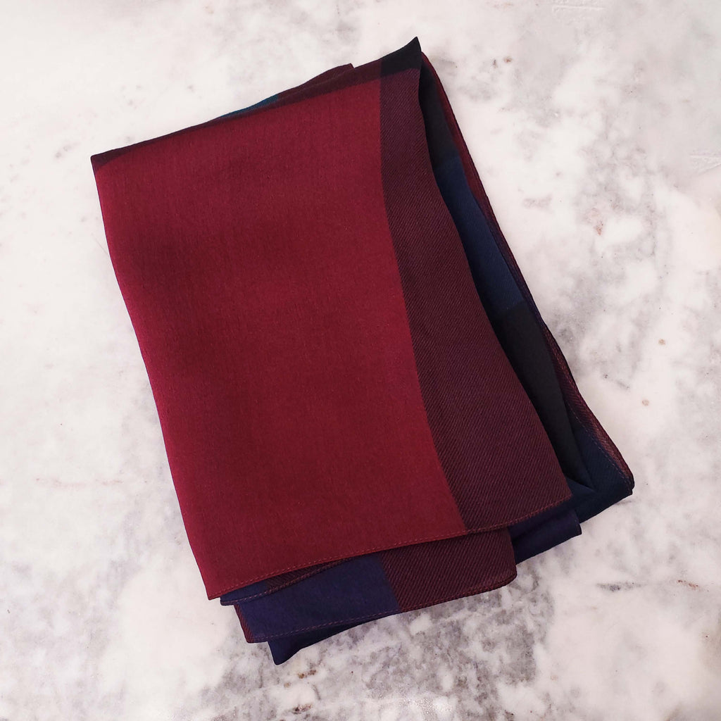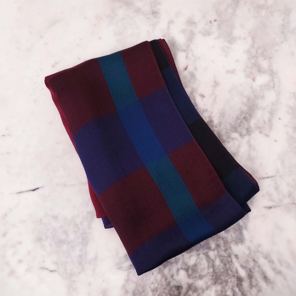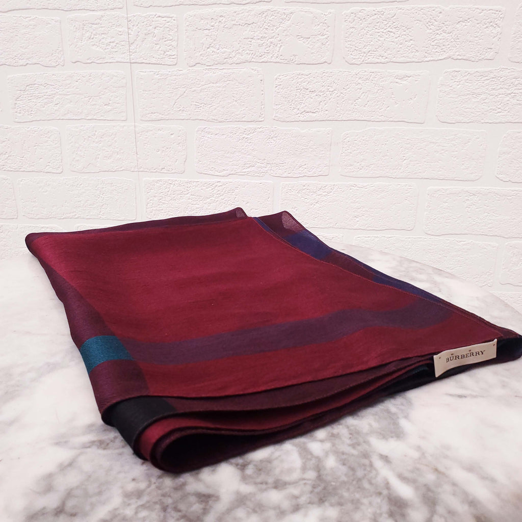 BURBERRY BLUE, BURGUNDY AND PURPLE SILK CHECK SCARF