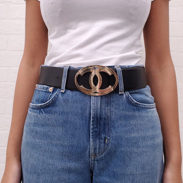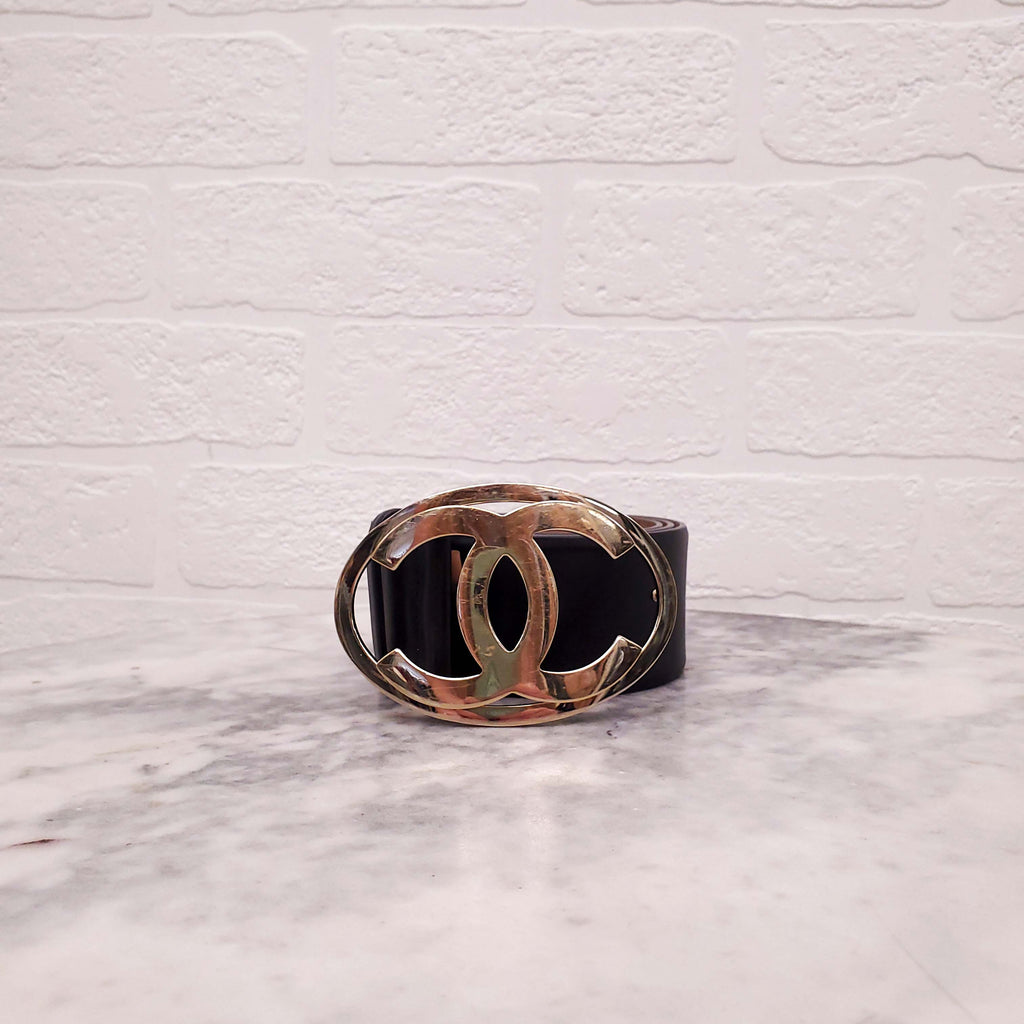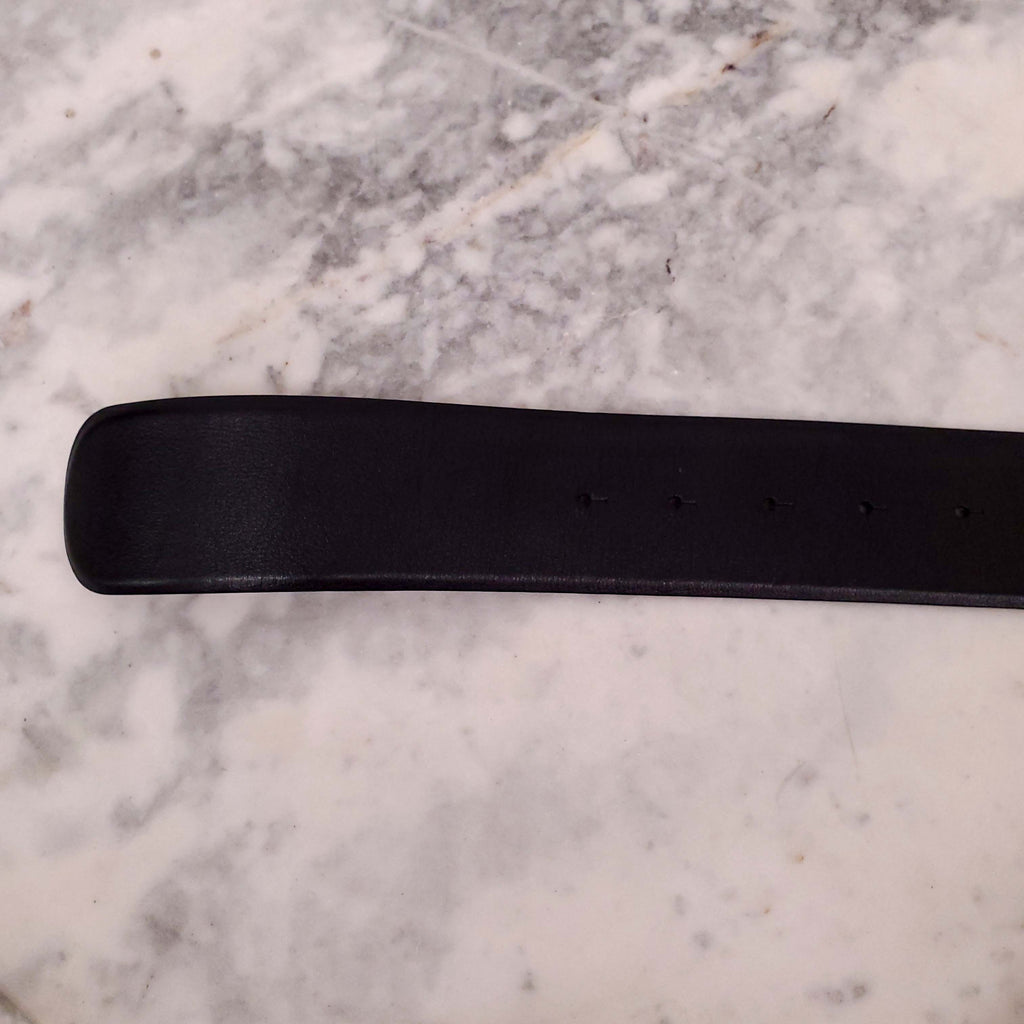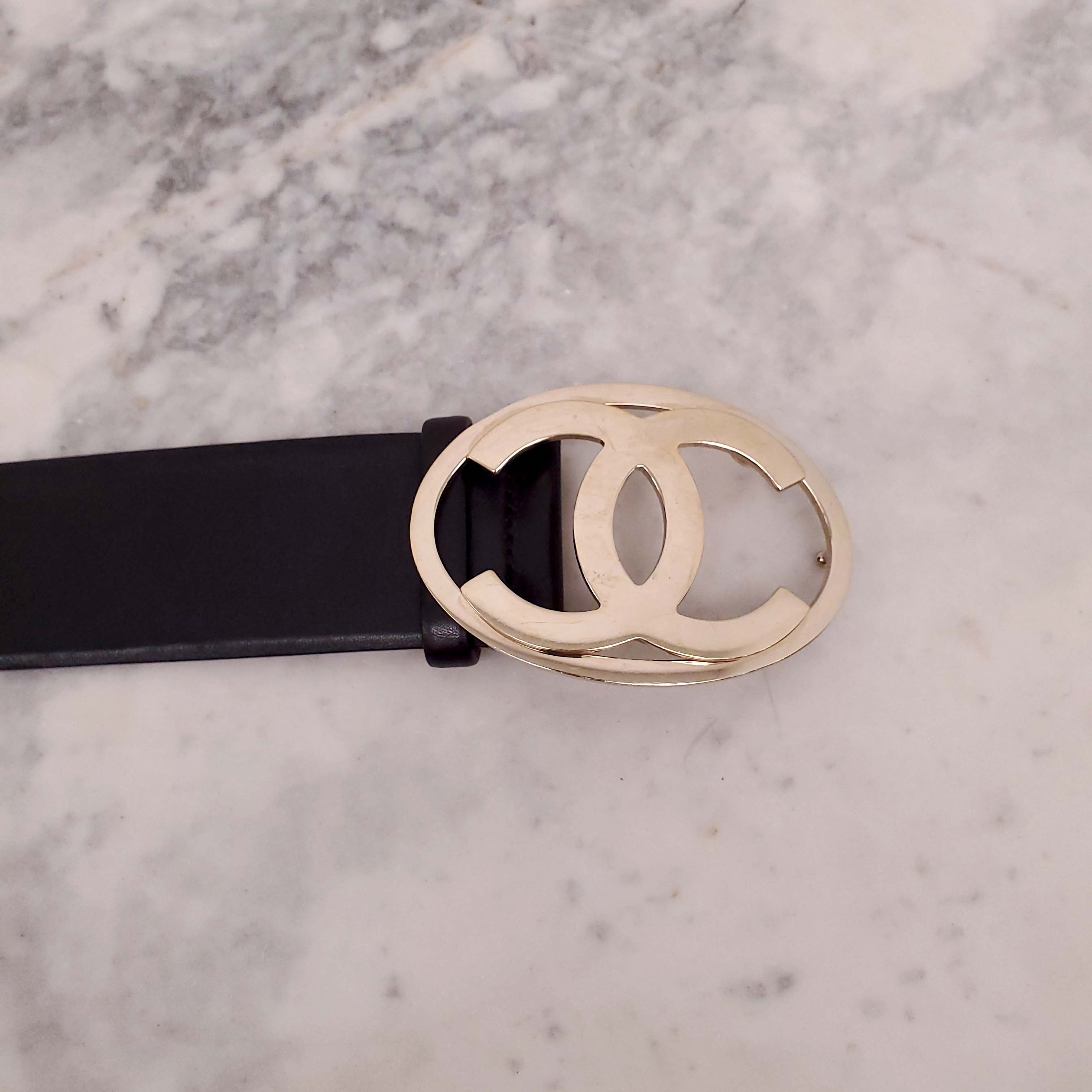 CHANEL BLACK LEATHER LOGO BELT - SIZE 80