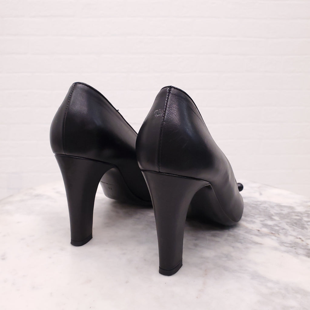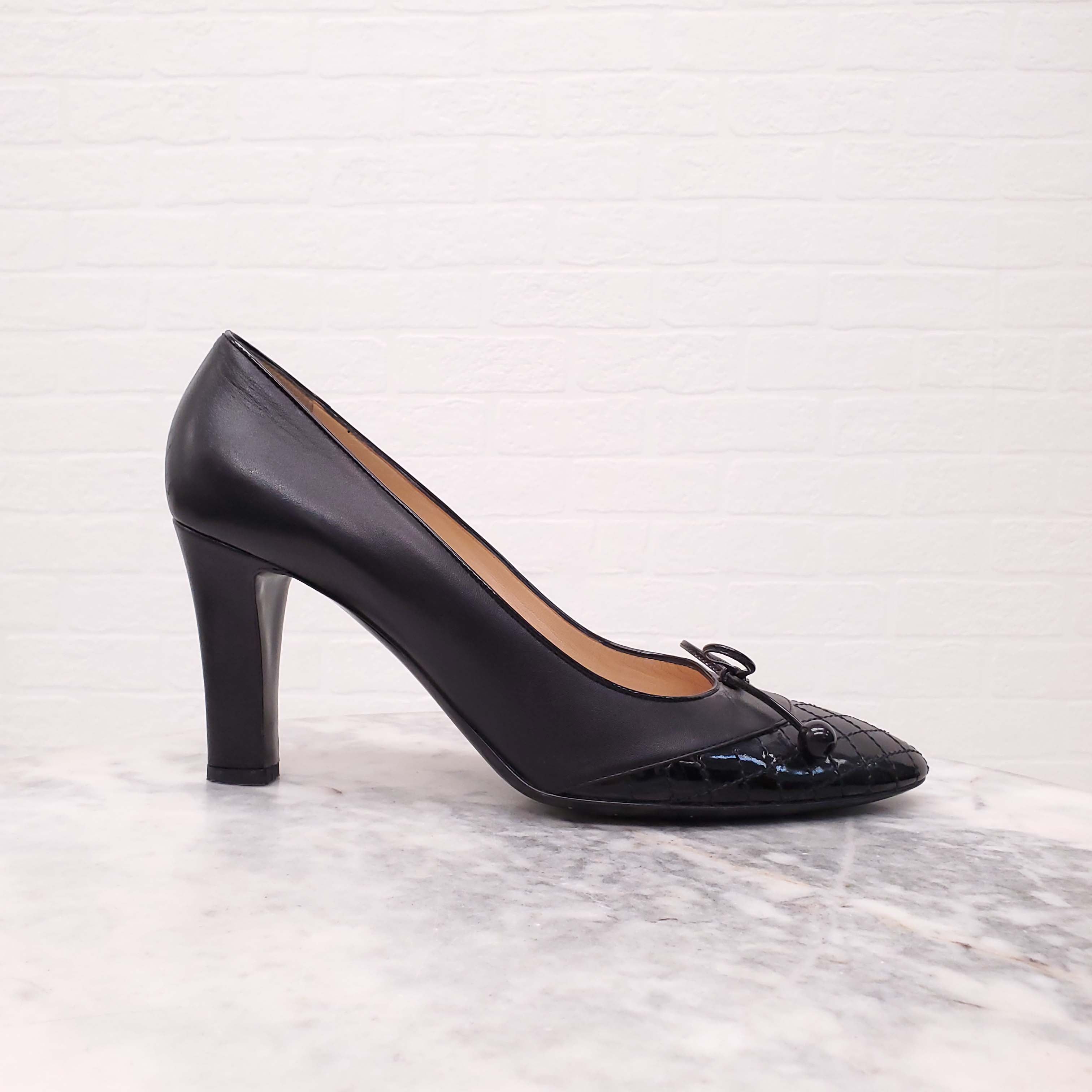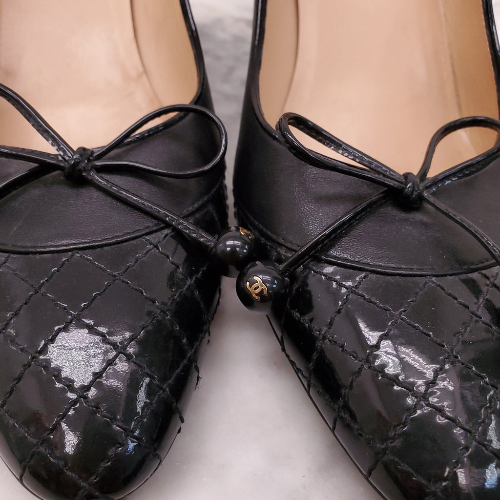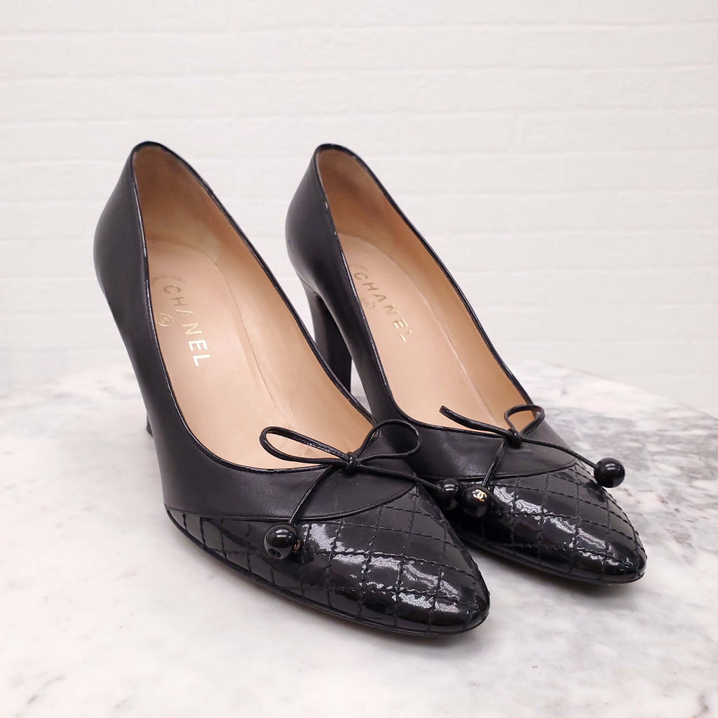 CHANEL BLACK QUILTED LEATHER HEELS WITH LOGO BOW - SIZE 41