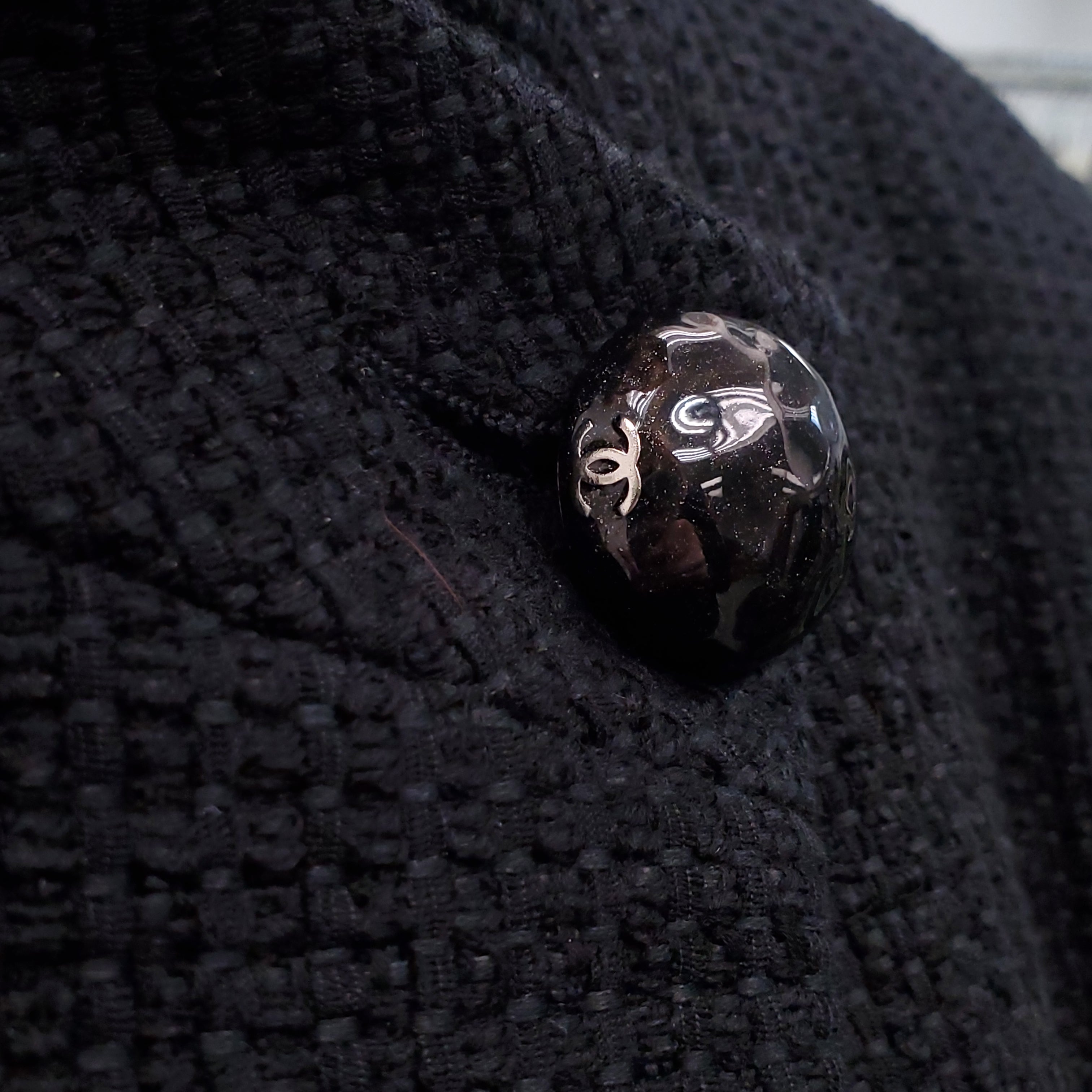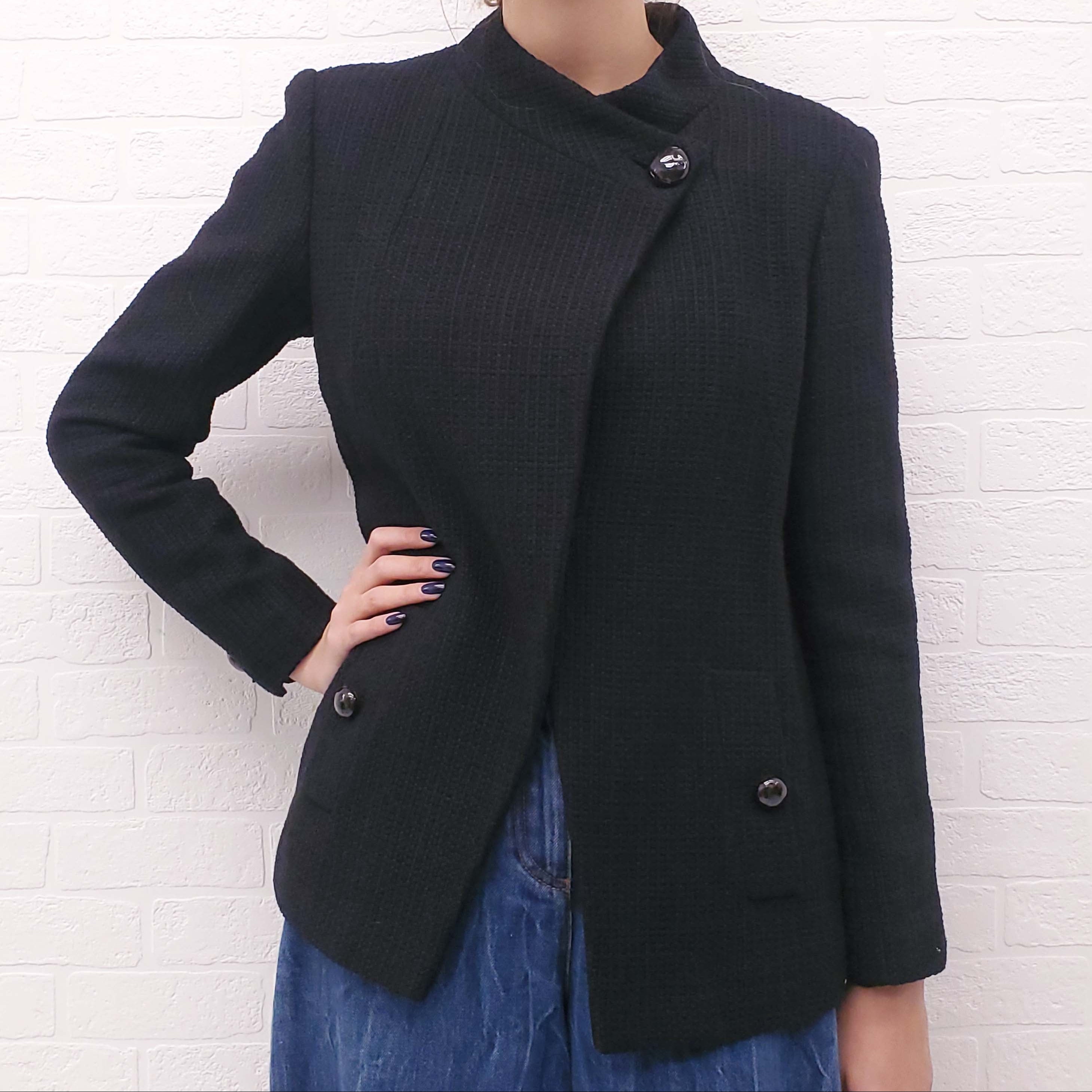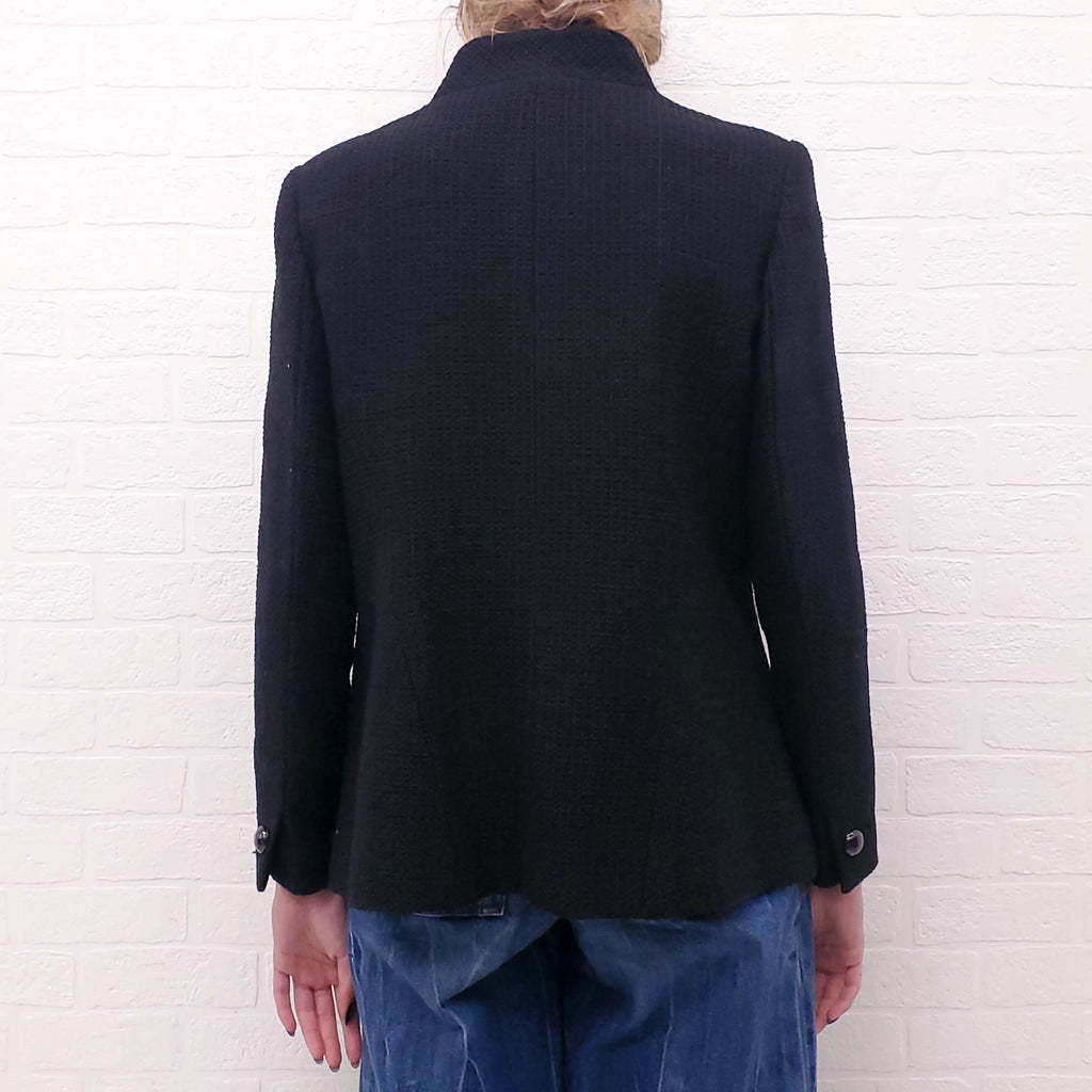 CHANEL 2015 BLACK TWEED ASYMMETRICAL JACKET WITH LOGO BUTTONS - SIZE 42