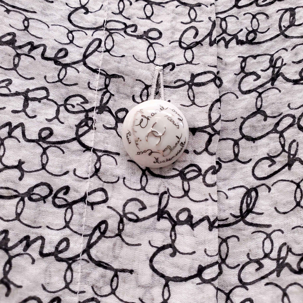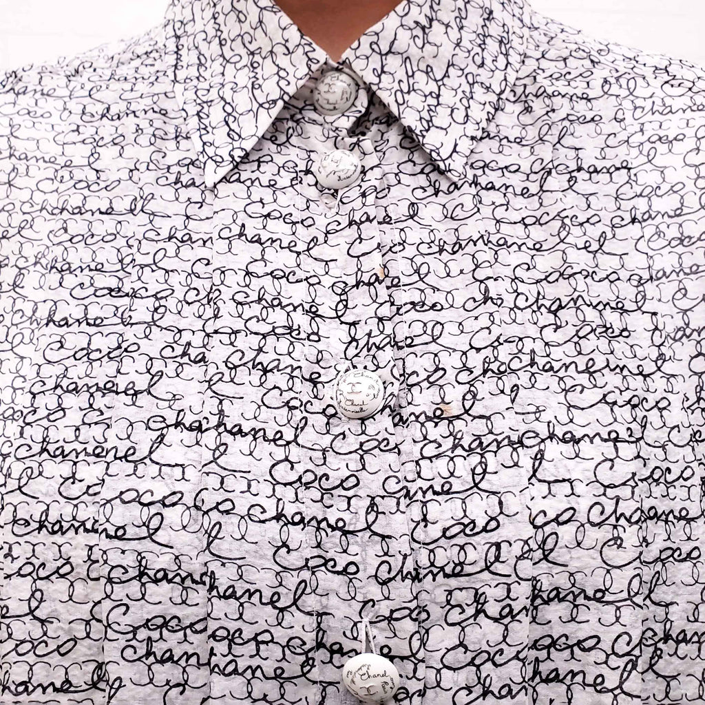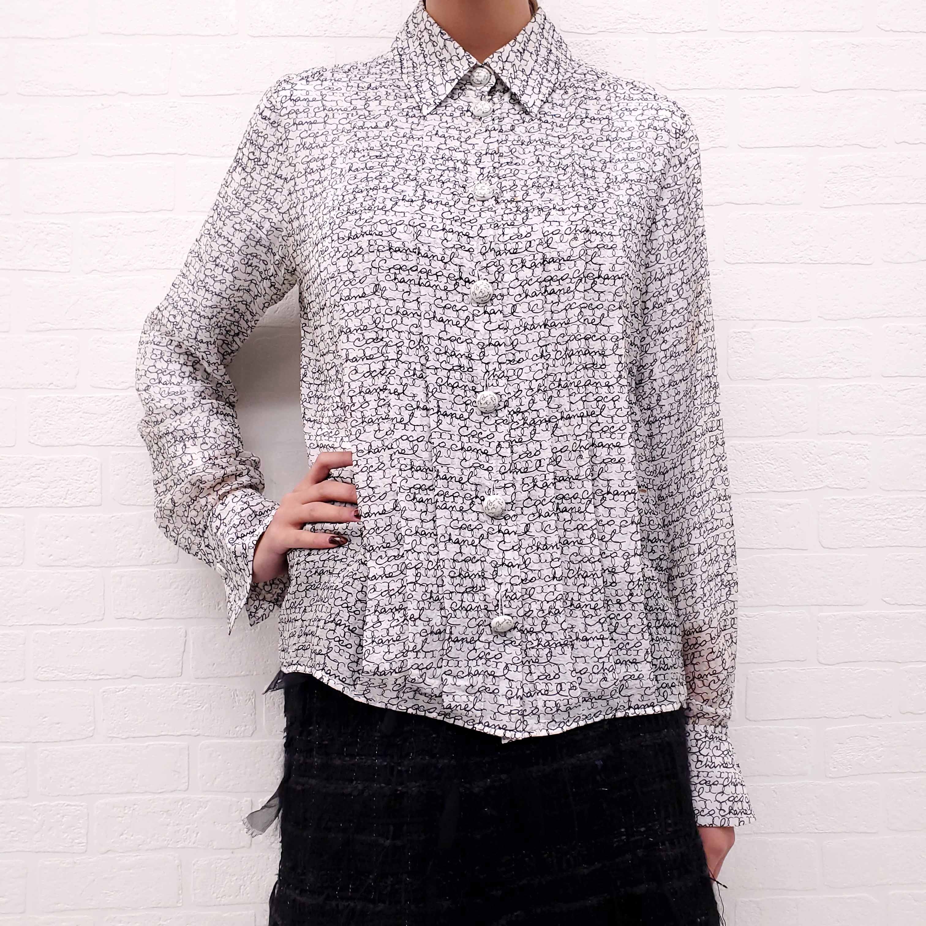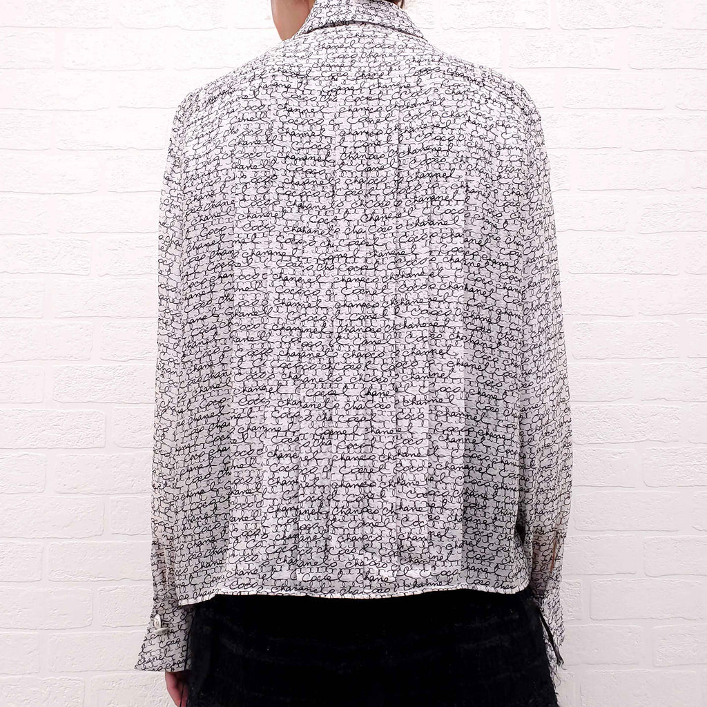 CHANEL CREAM AND BLACK SILK CURSIVE LOGO BLOUSE - SIZE 42