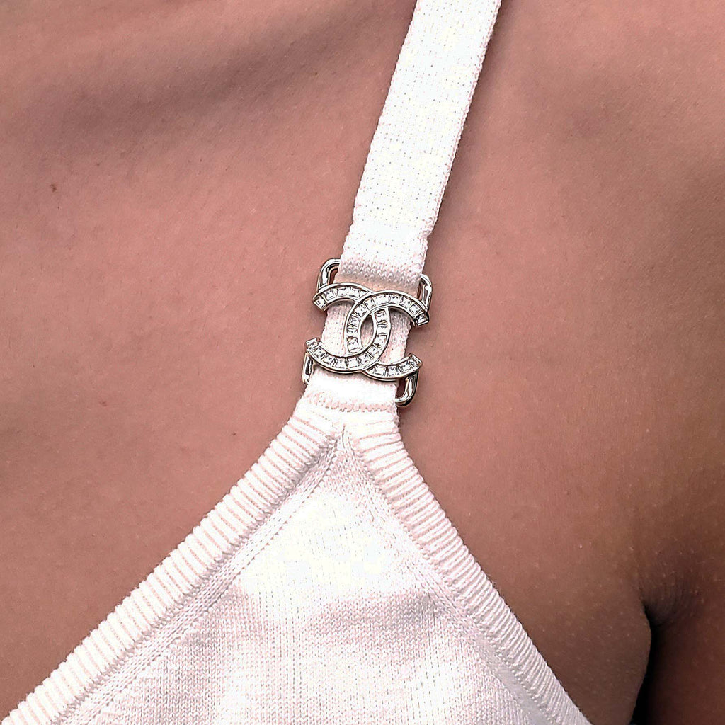 CHANEL CREAM KNIT TANK TOP WITH CRYSTAL LOGO STRAP - SIZE 36