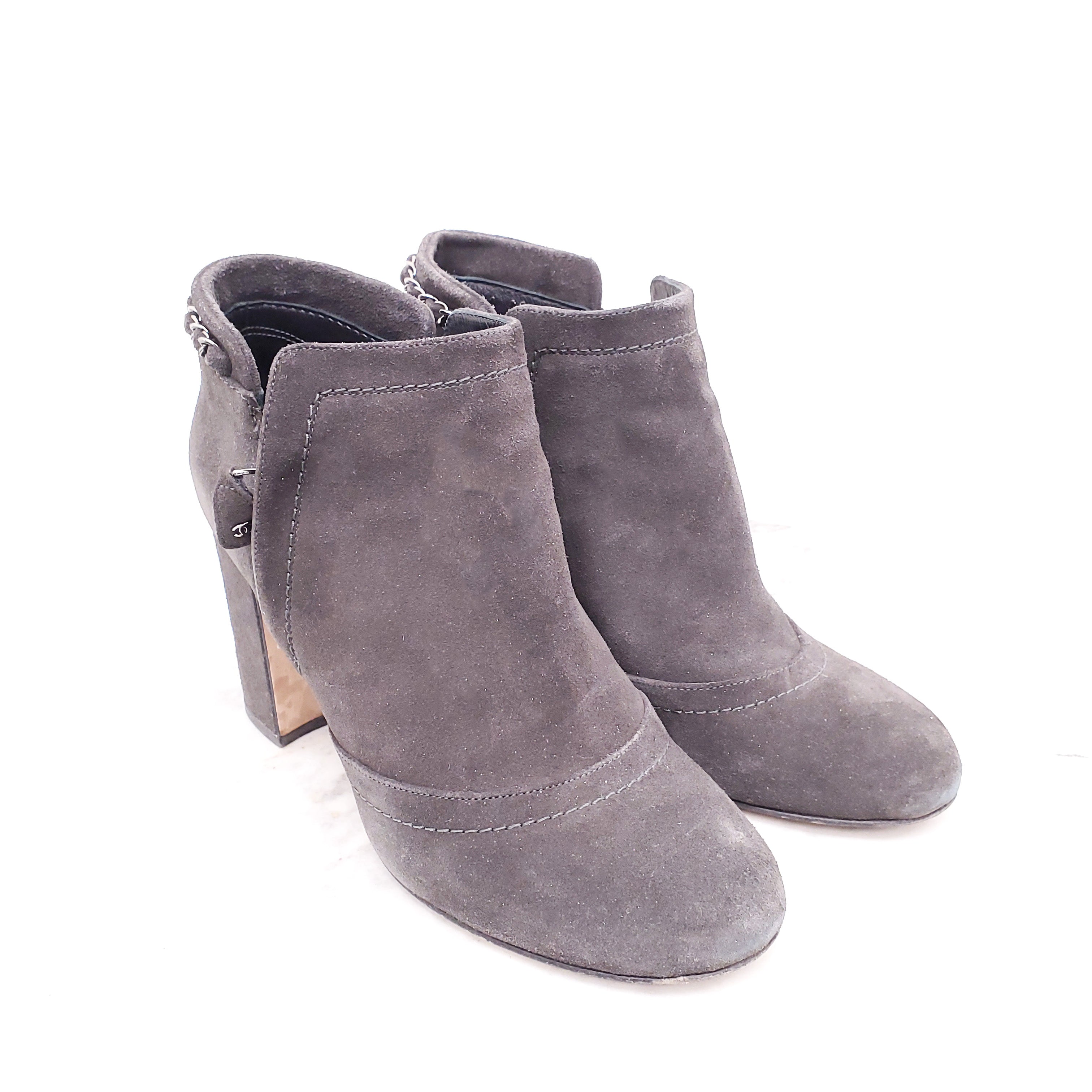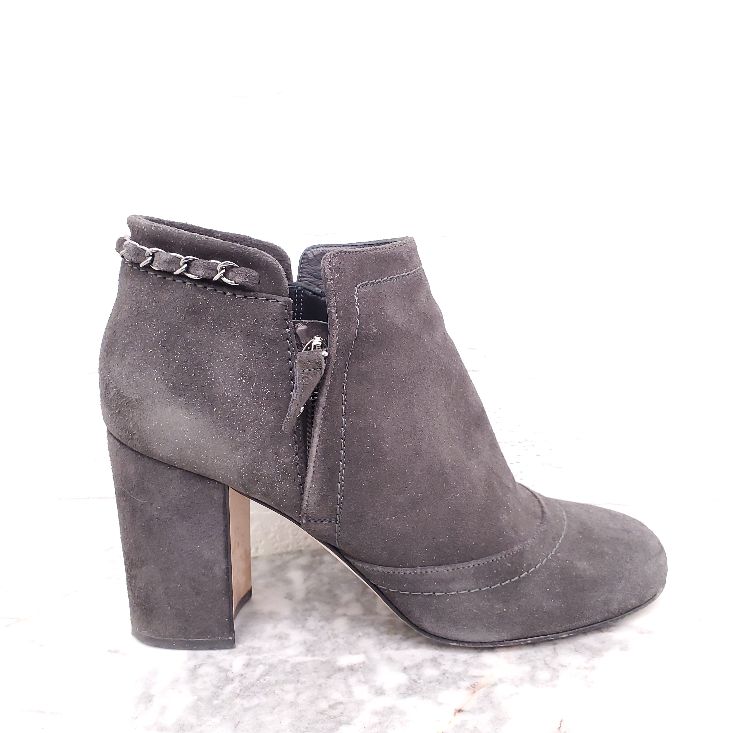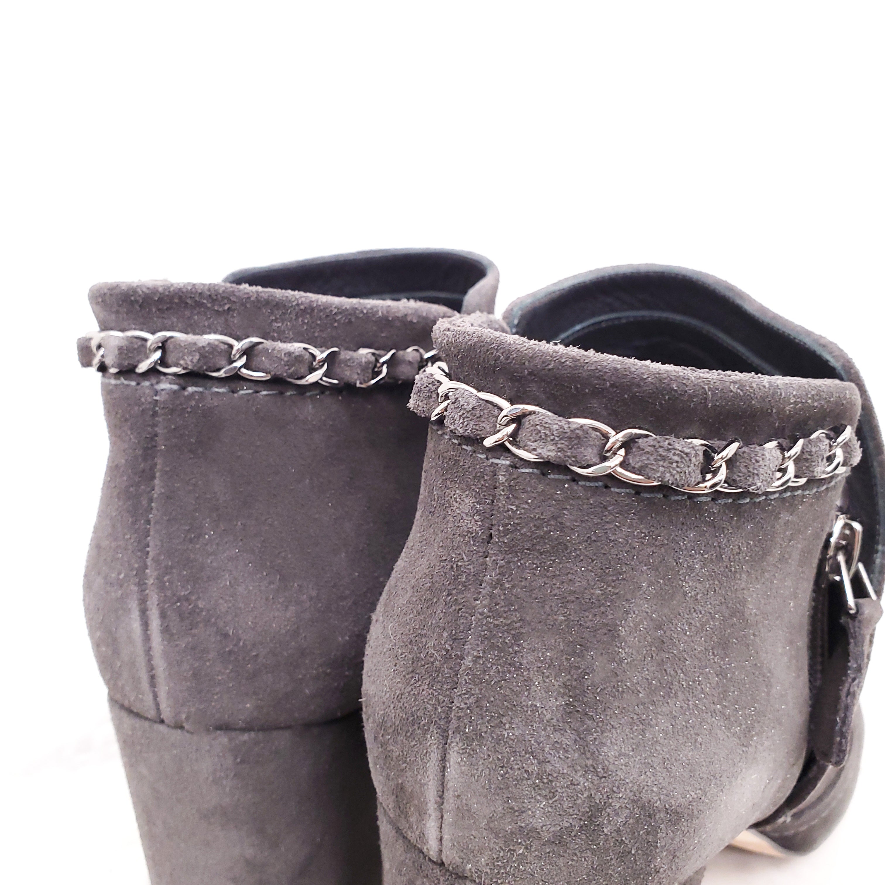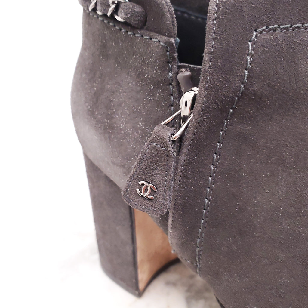 CHANEL GREY SUEDE BOOTIES WITH CHAIN DETAIL AND LOGO - SIZE 39