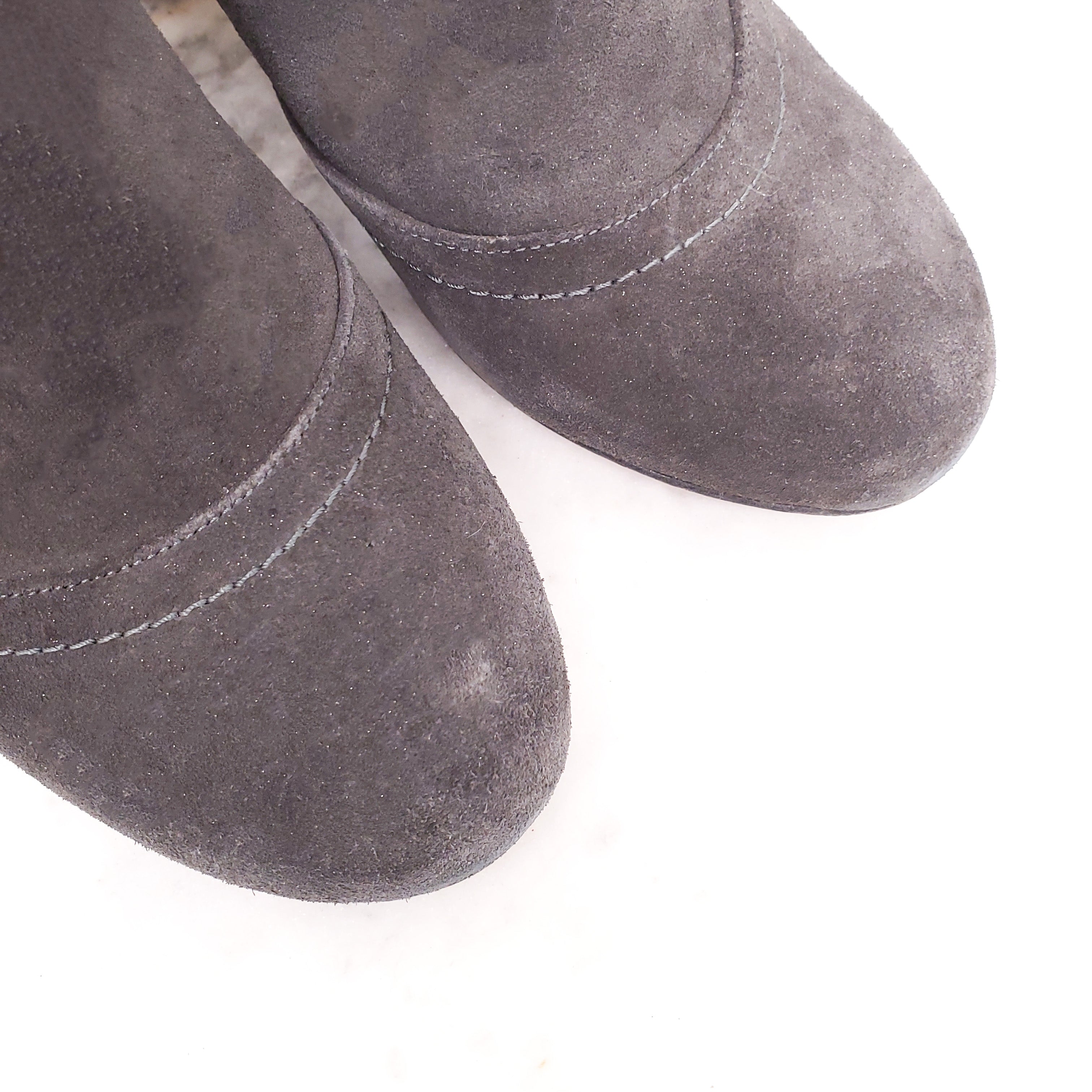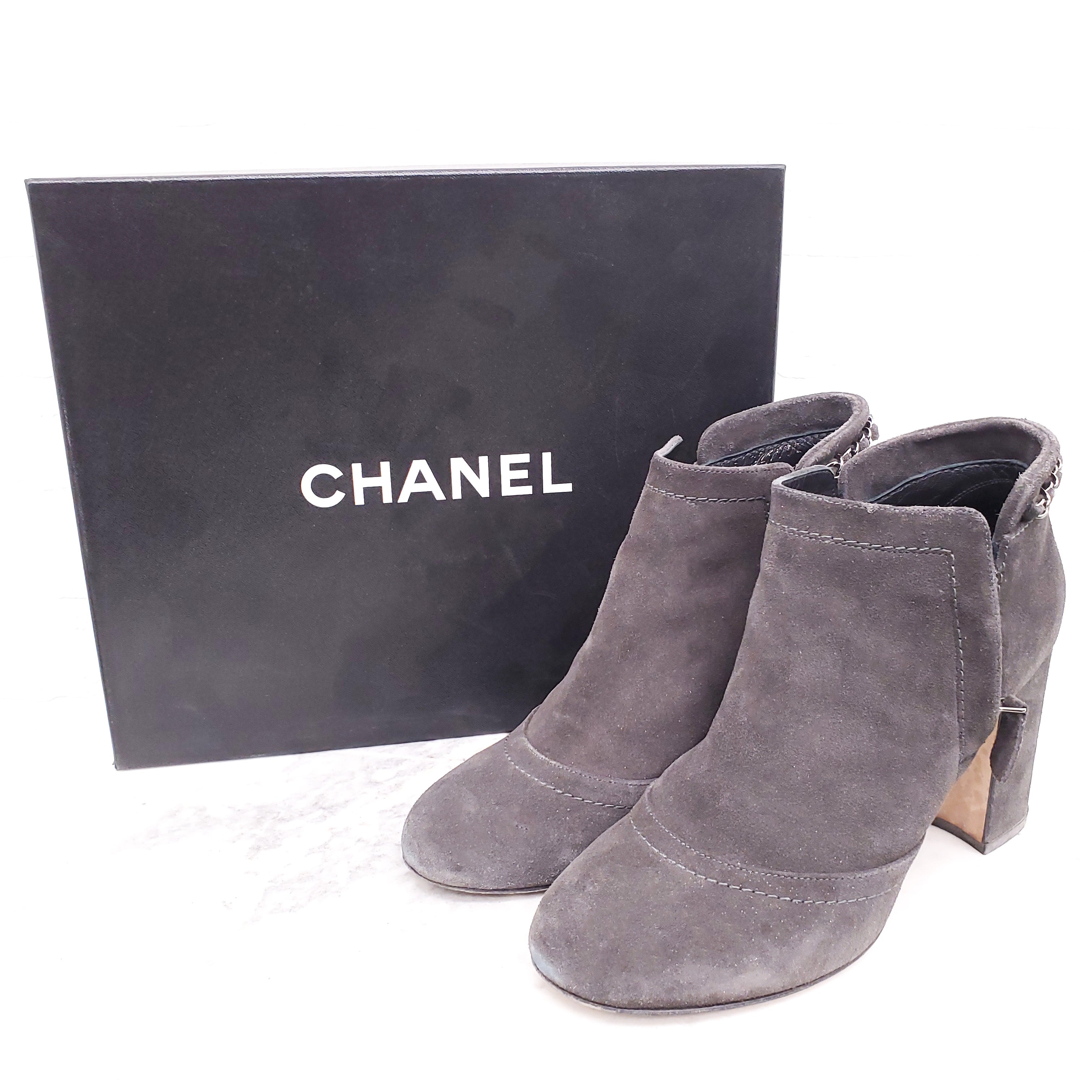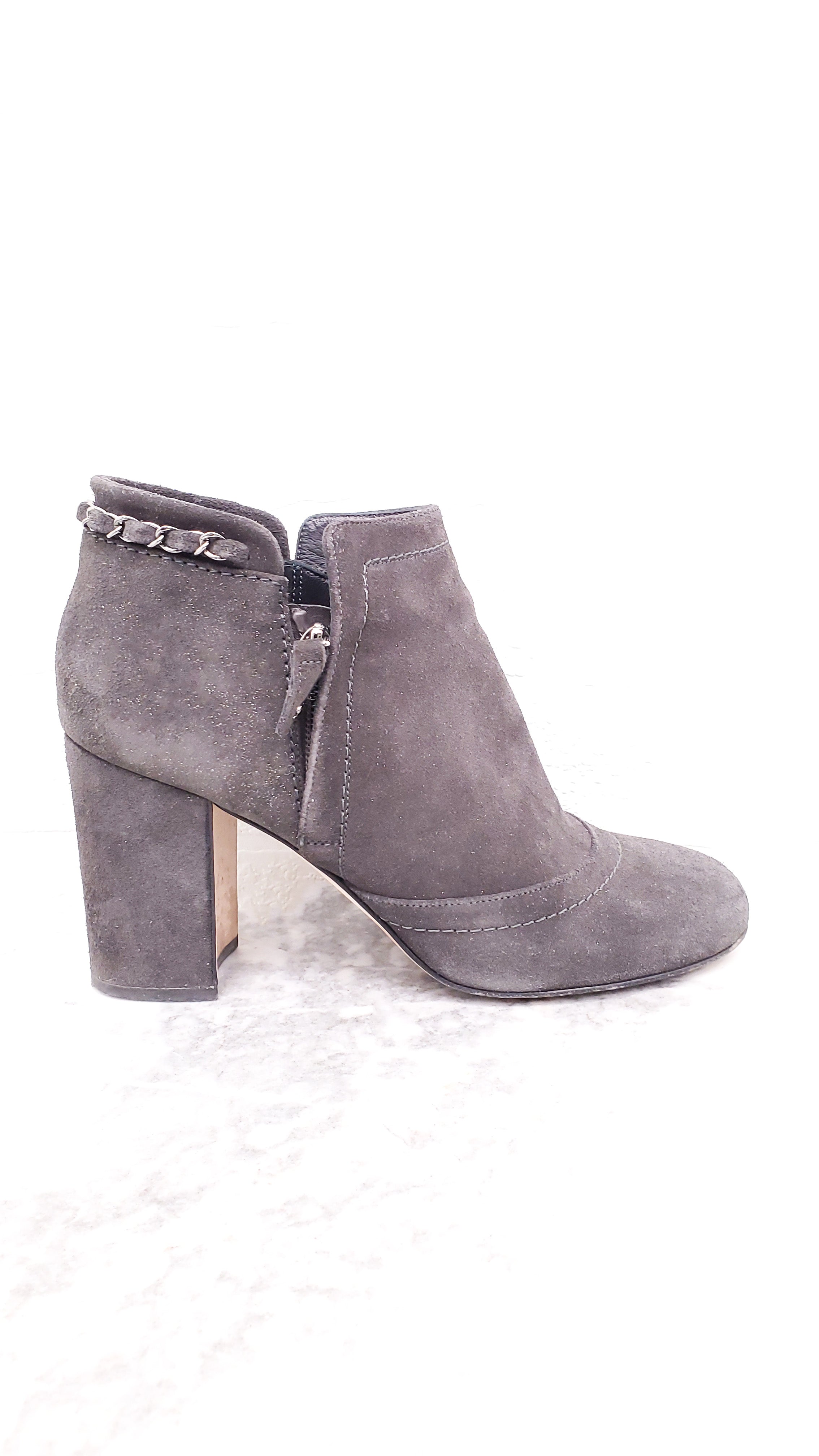 CHANEL GREY SUEDE BOOTIES WITH CHAIN DETAIL AND LOGO - SIZE 39
