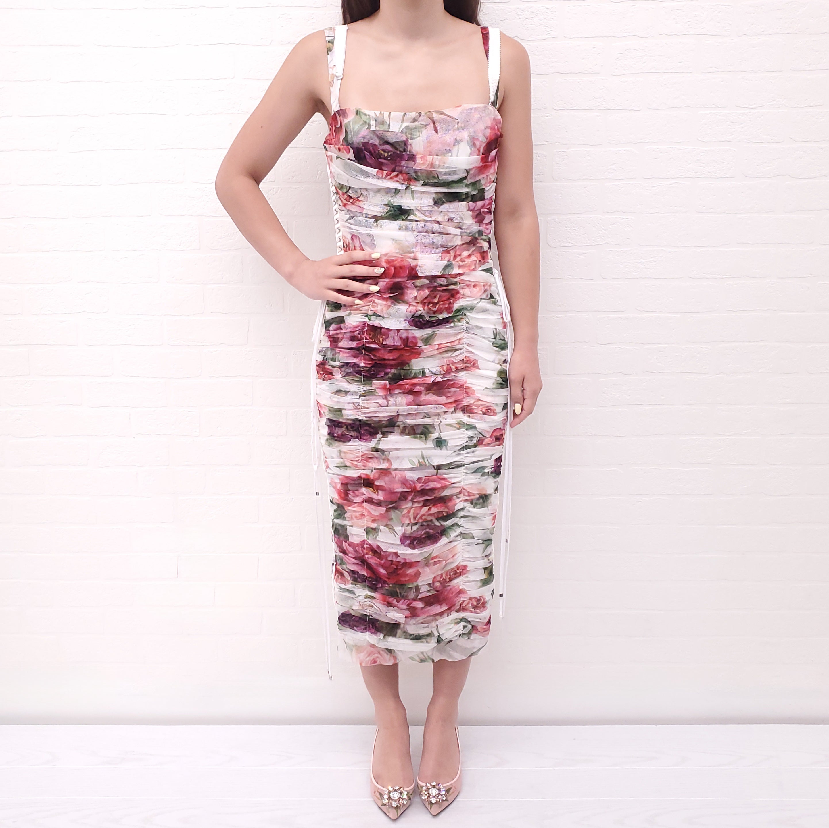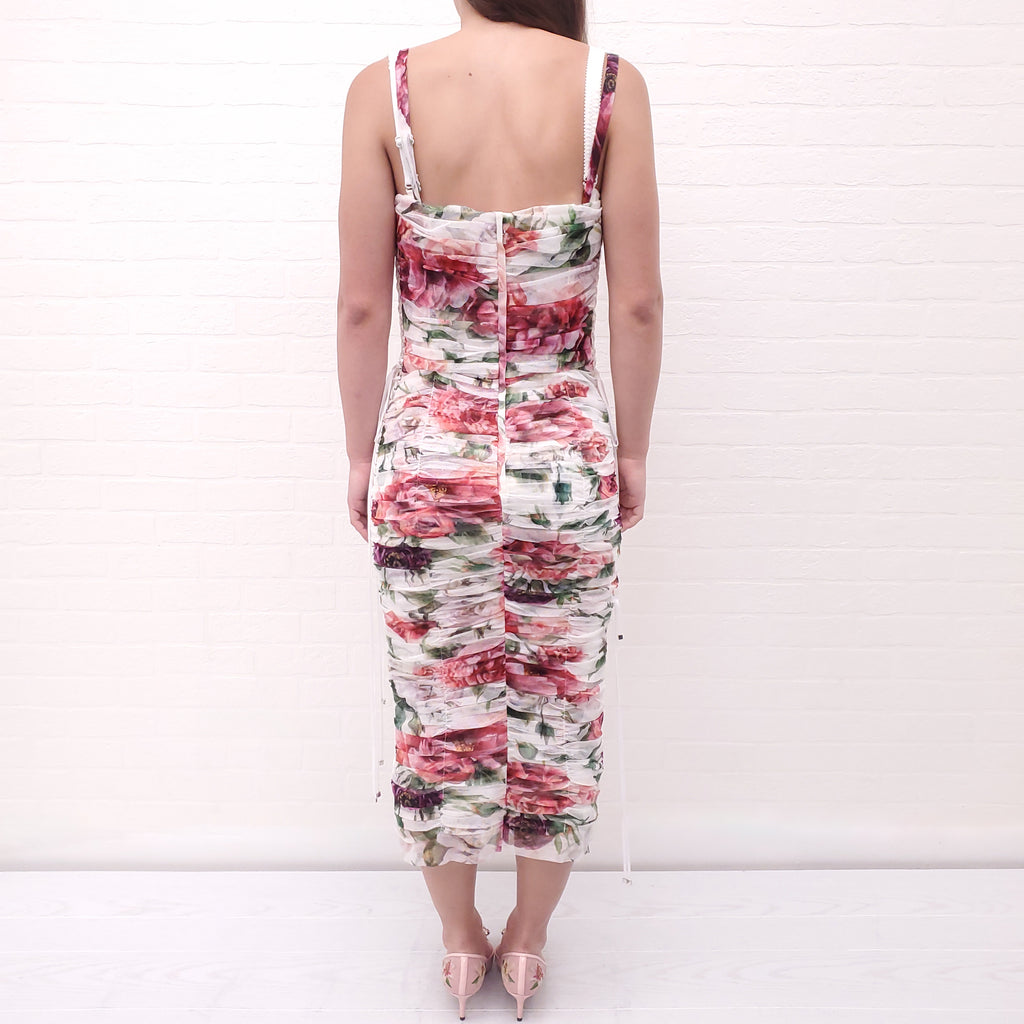 DOLCE & GABBANA WHITE ROUCHED FLORAL MESH MIDI DRESS WITH LACE UP DETAIL - SIZE 44