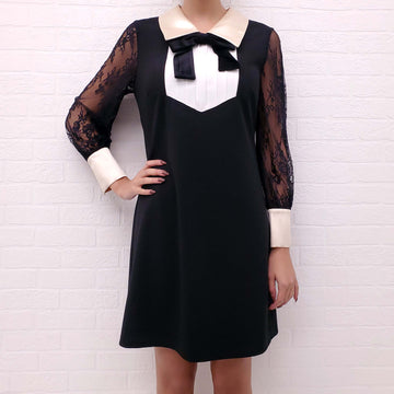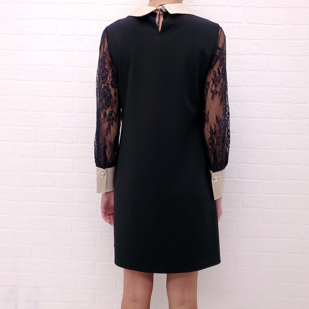 EDWARD ACHOUR PARIS BLACK TUXEDO DRESS WITH LACE SLEEVES AND CRYSTAL BUTTONS - SIZE 38