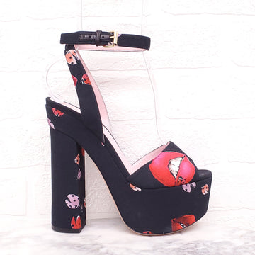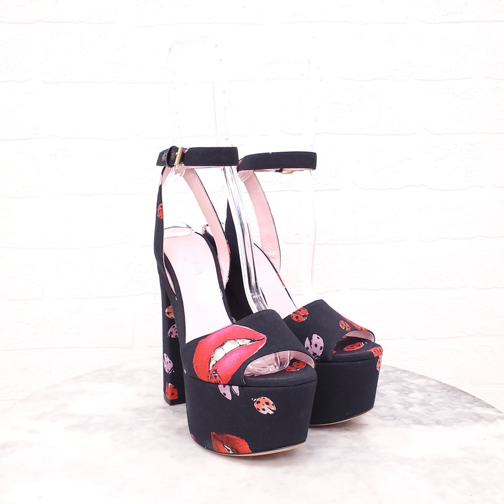 GIAMBA BLACK LIPS AND LADYBUG PRINTED PLATFORM HEELS - SIZE 37.5