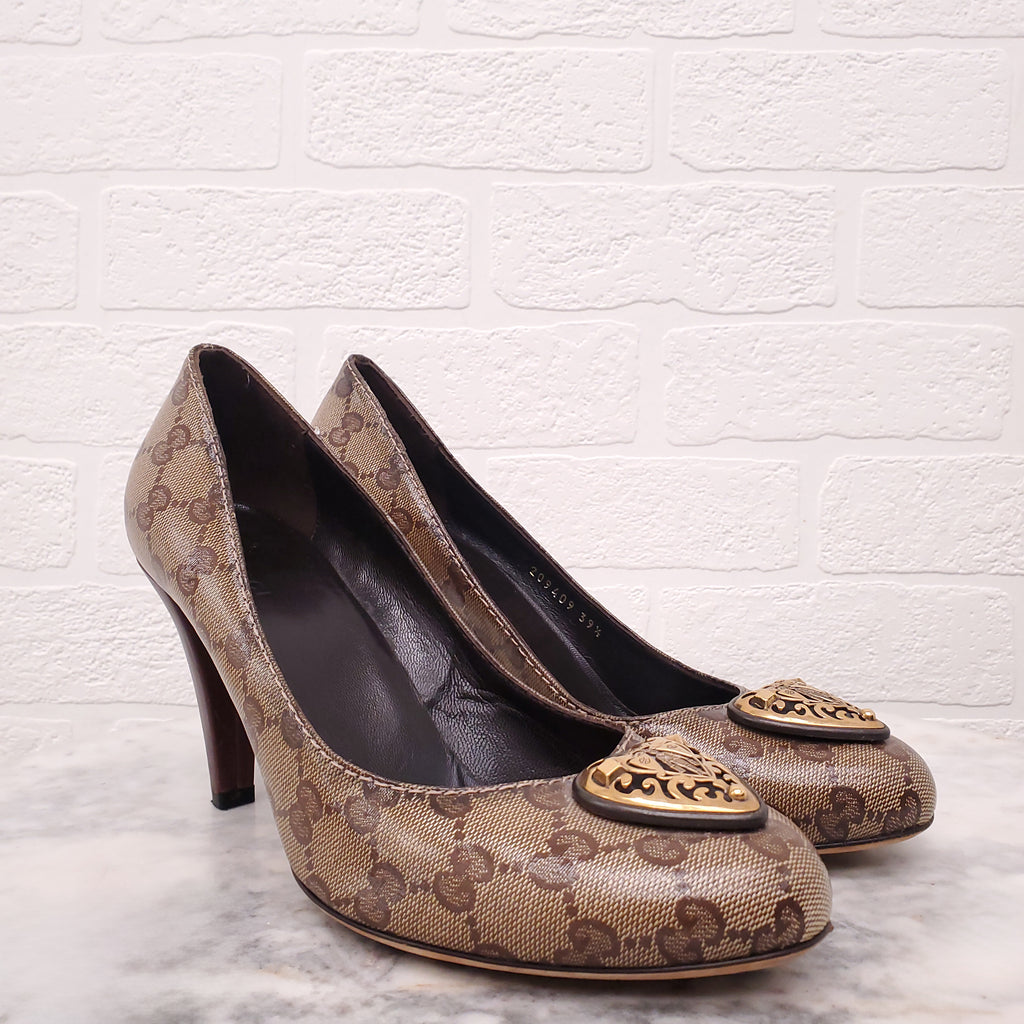 GUCCI LOGO HEELS WITH GOLD HEART EMBLEM - SIZE 39.5