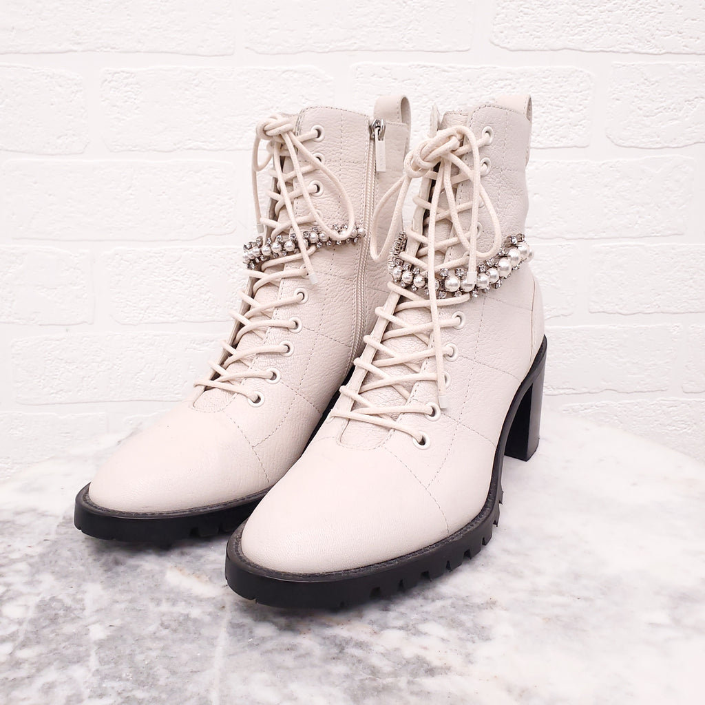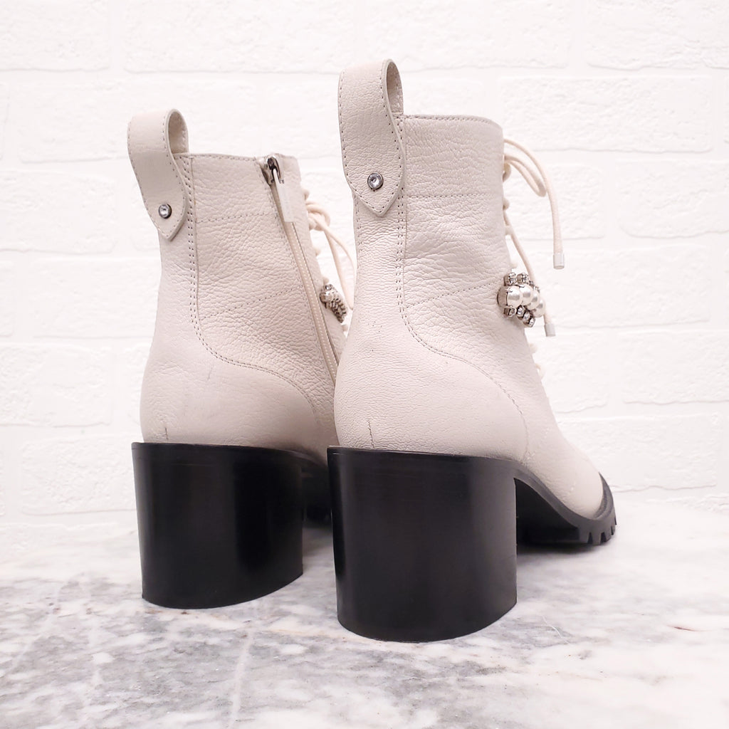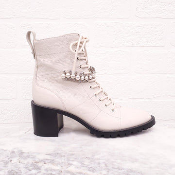 JIMMY CHOO CREAM LEATHER MOTORCYCLE BOOTS WITH PEARL DETAIL - SIZE 40.5