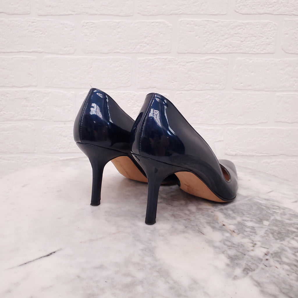 MANOLO BLAHNIK PATENT BLUE METALLIC HEELS - SIZE 38