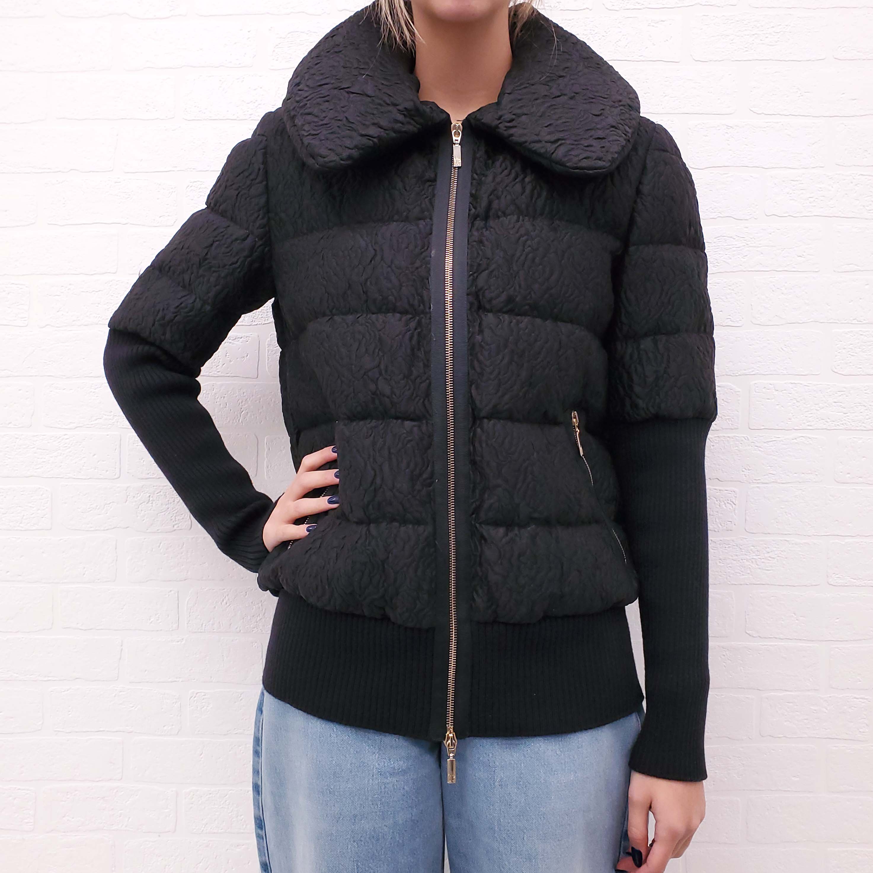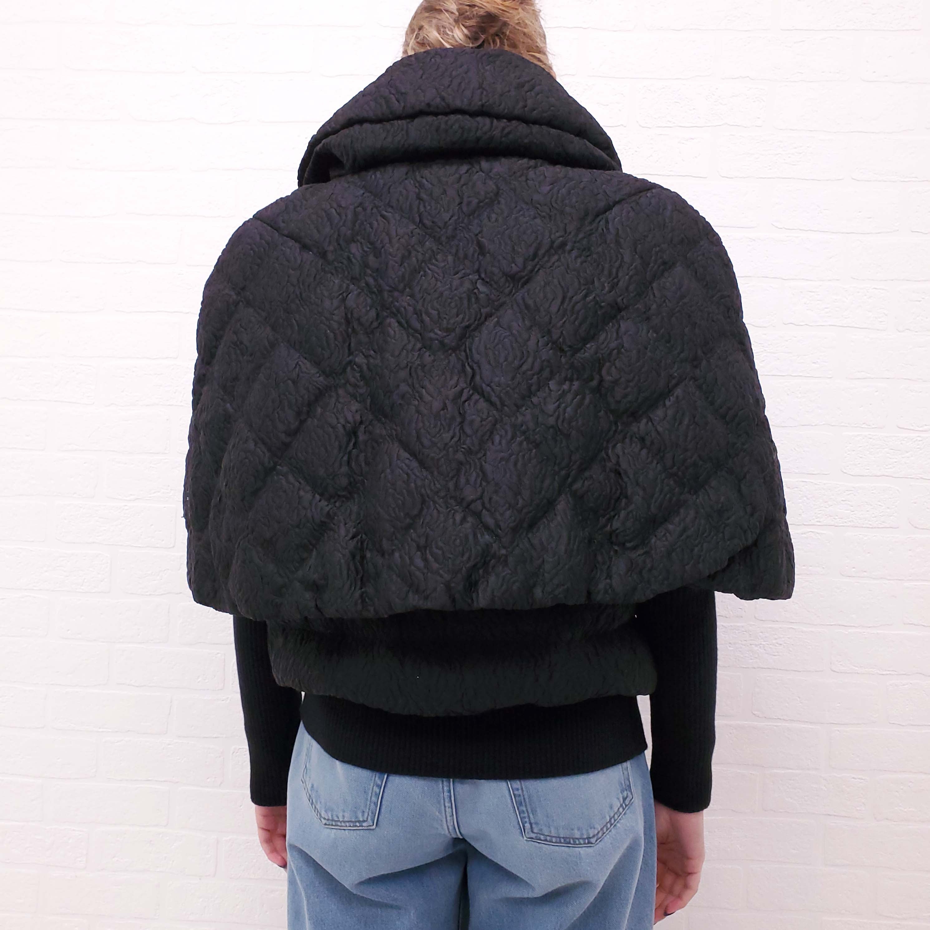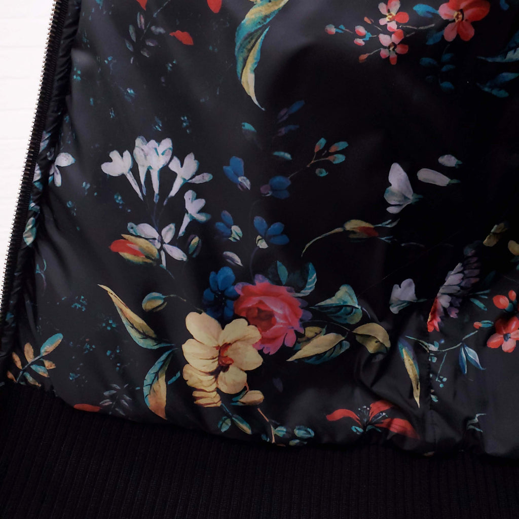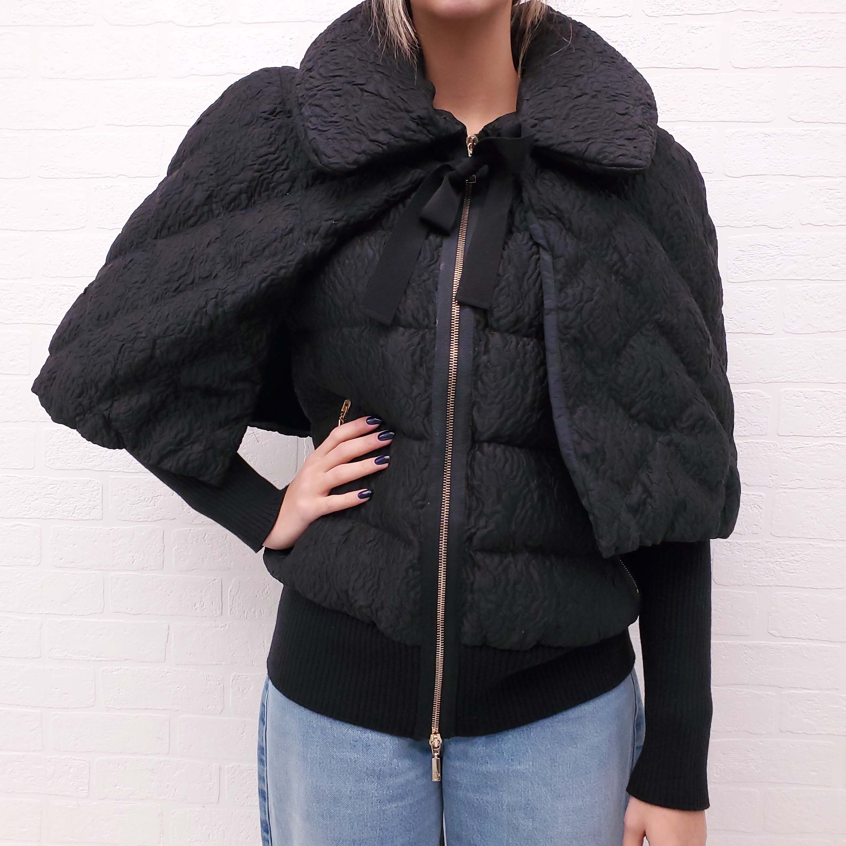 MONCLER BLACK TAPESTRY PUFFER JACKET WITH CAPE AND FLORAL LINING - SIZE 2/M