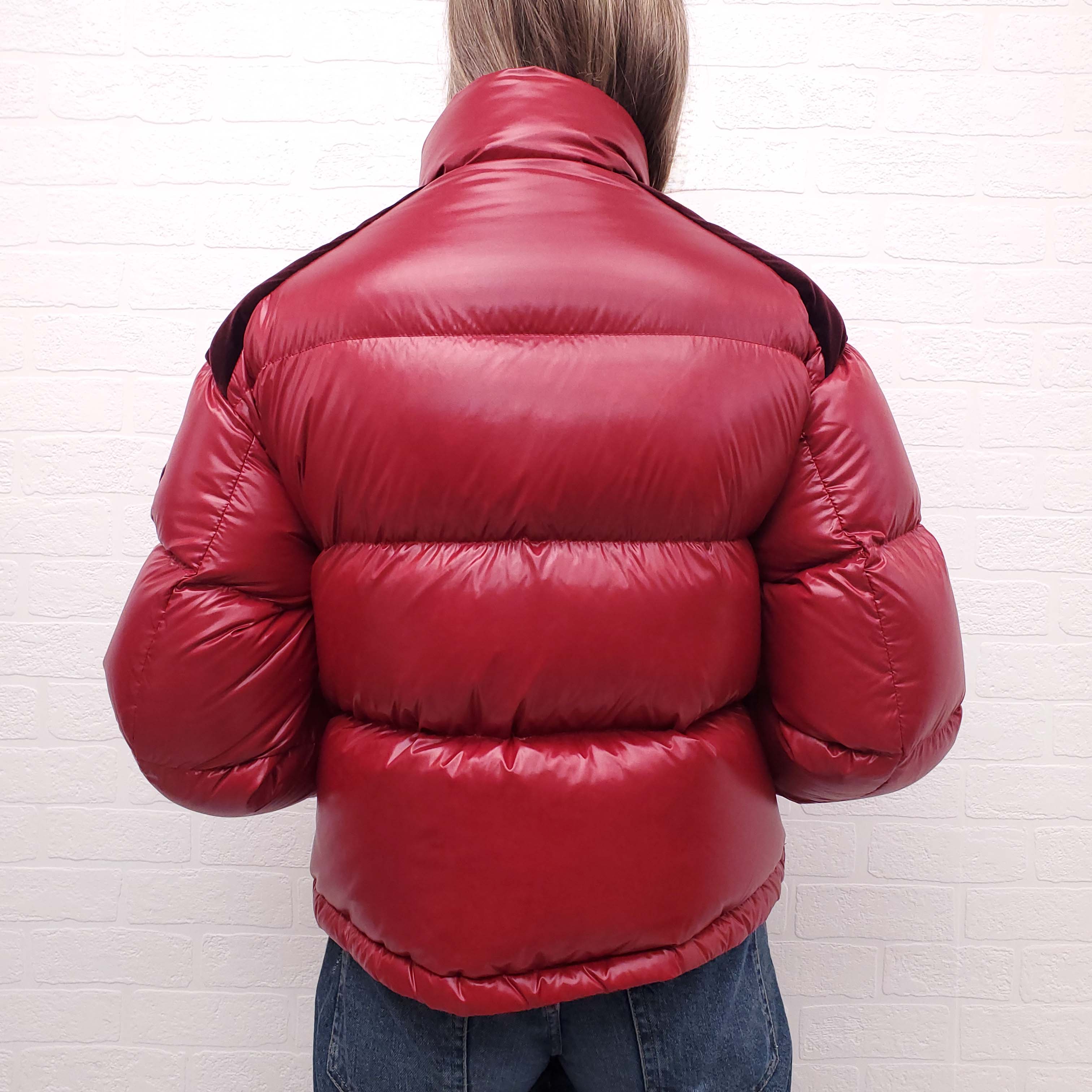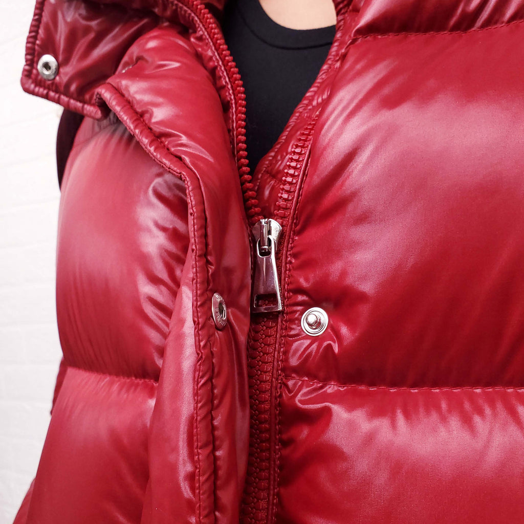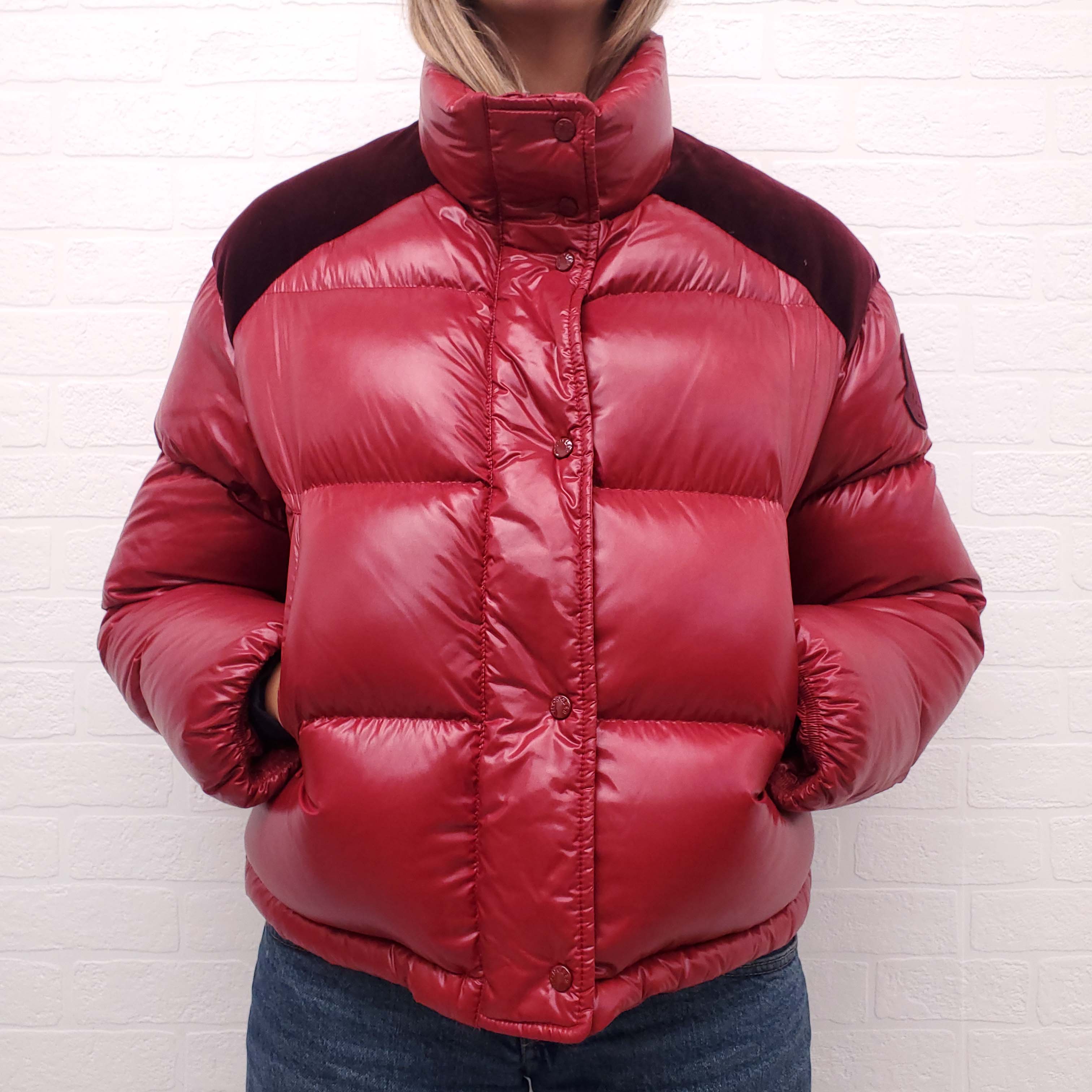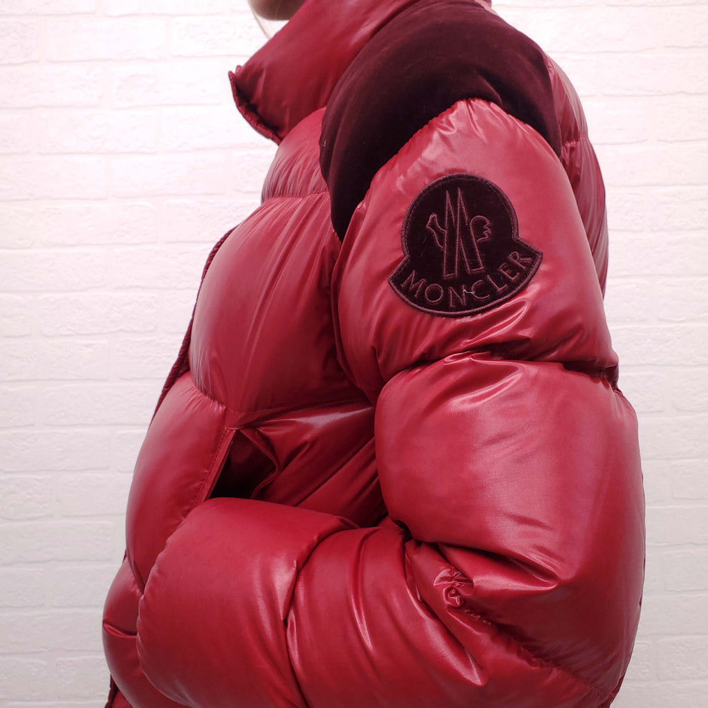 MONCLER RED AND BURGUNDY VELVET DETAIL PUFFER JACKET - SIZE 0/XS