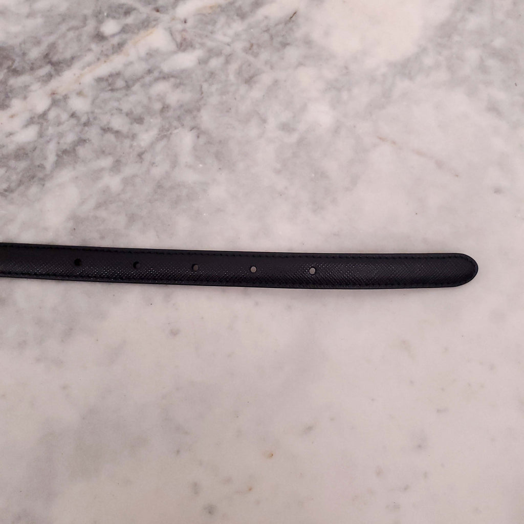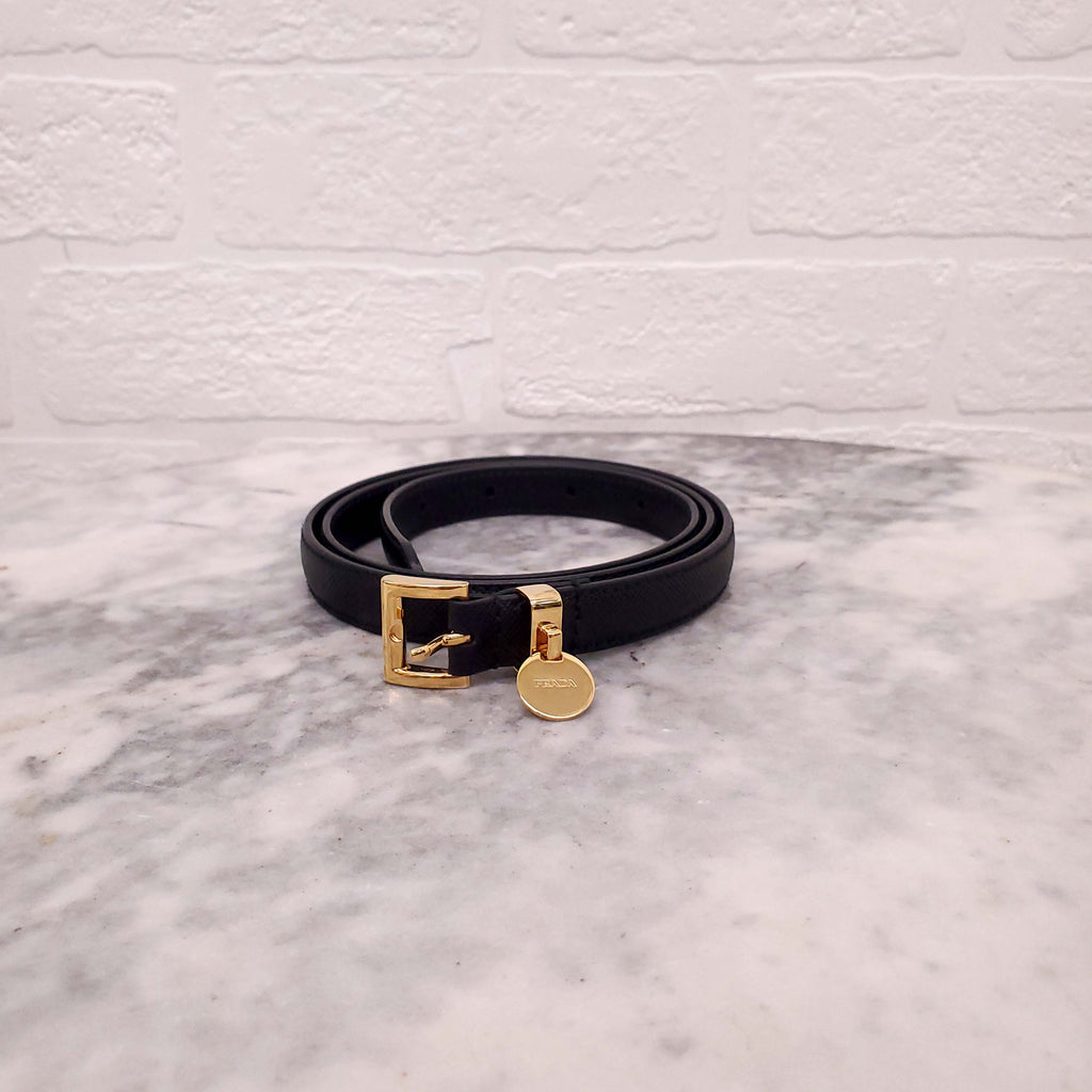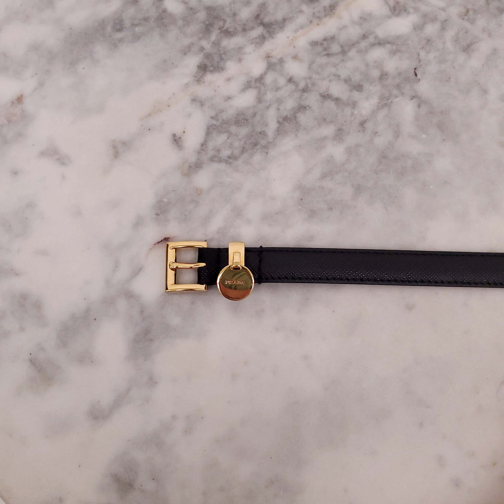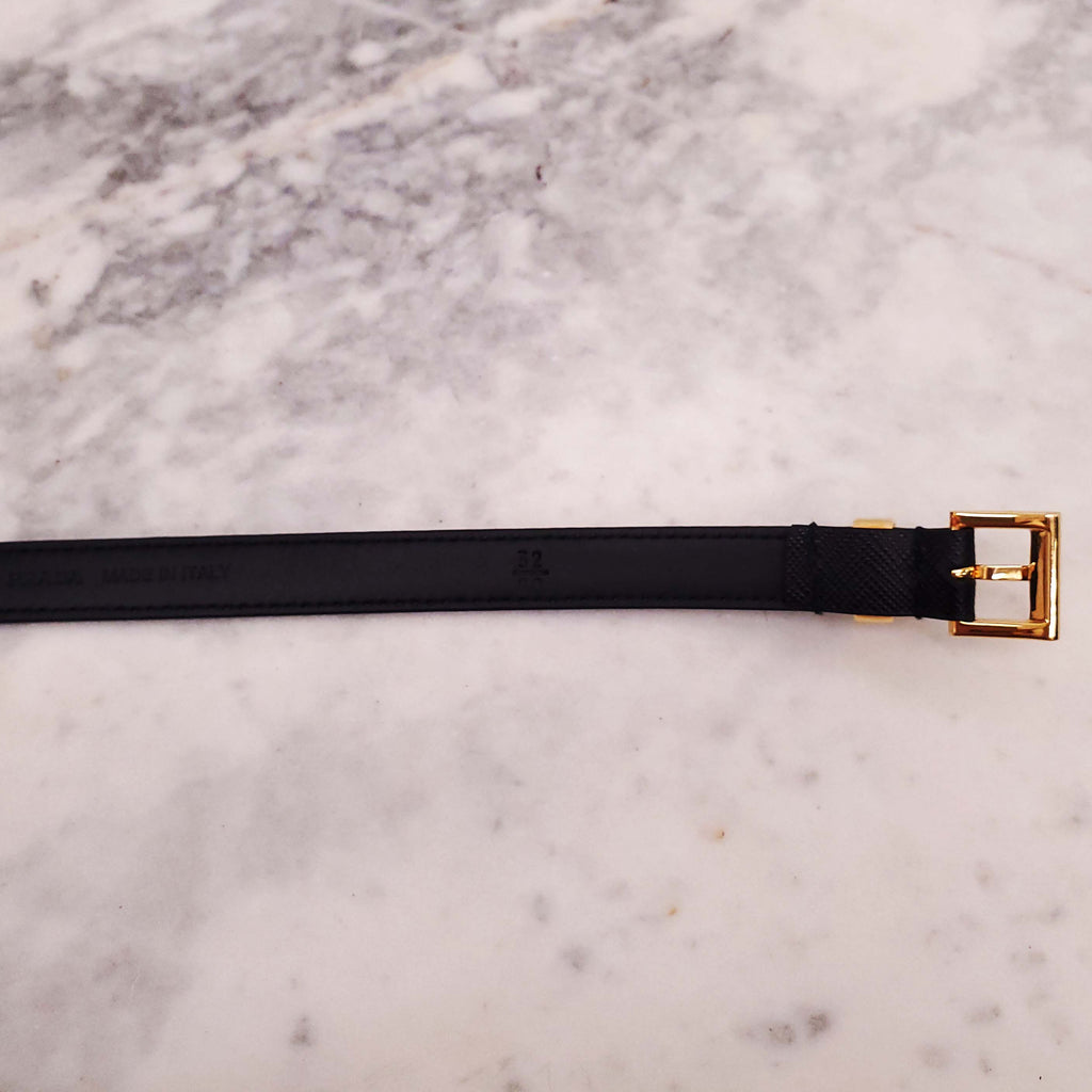 PRADA BLACK SAFFIANO LEATHER BELT WITH GOLD LOGO CHARM - SIZE 80
