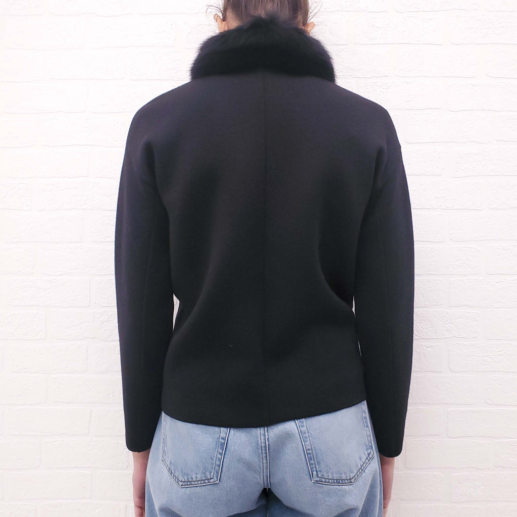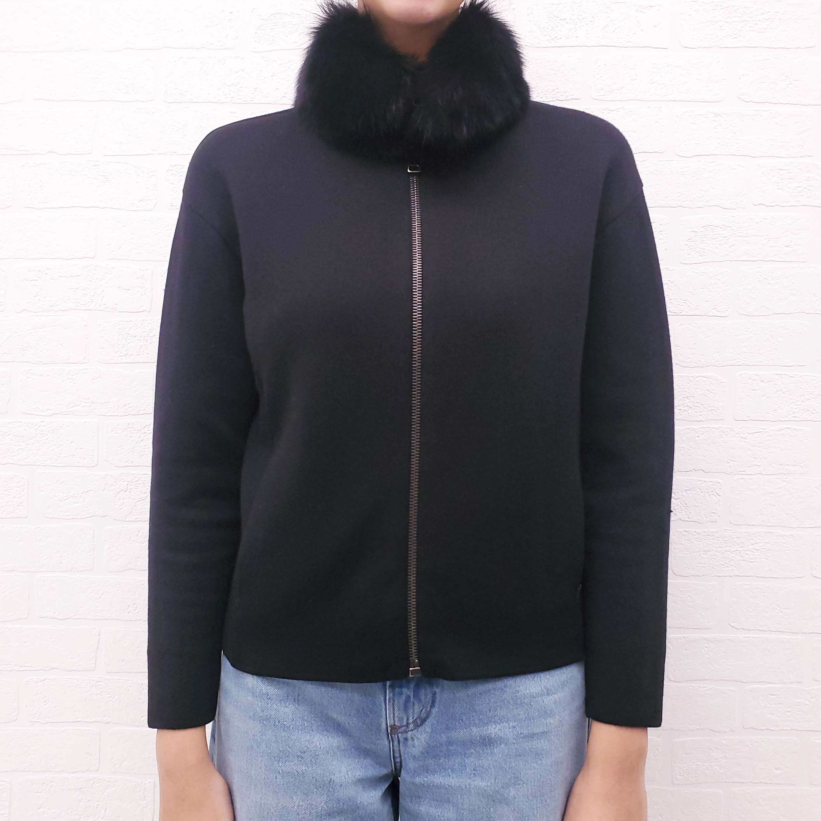 PRADA BLACK ZIP UP SWEATER WITH FUR COLLAR - SIZE 40