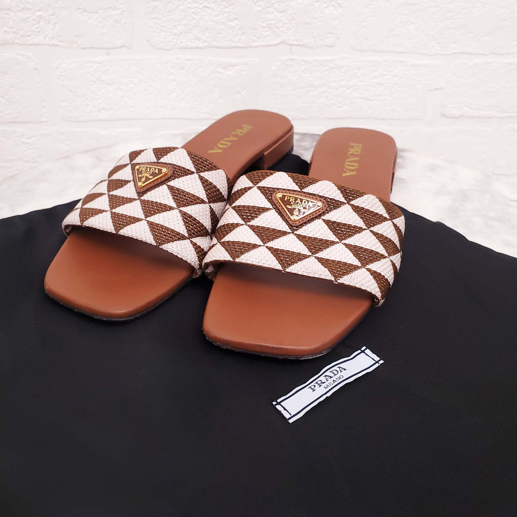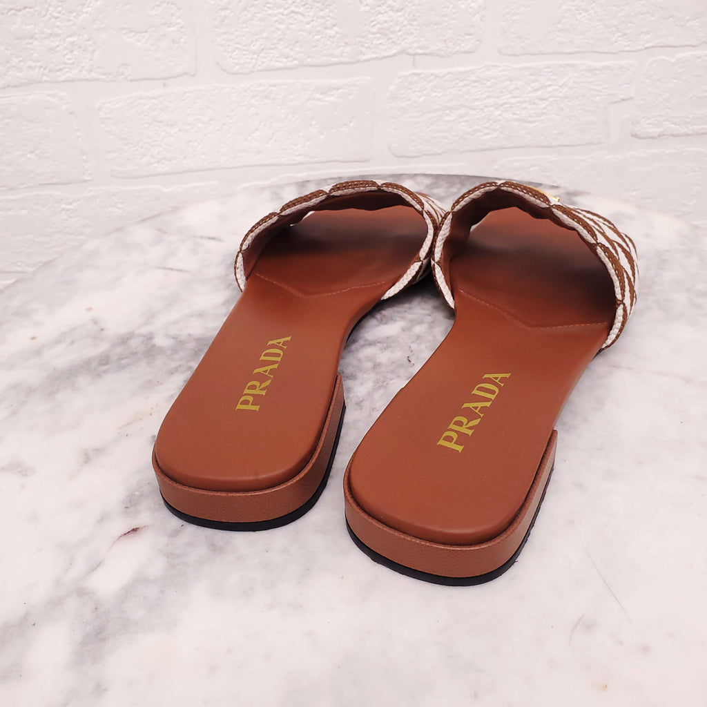 PRADA CREAM AND TAN LOGO SLIDES - SIZE 40