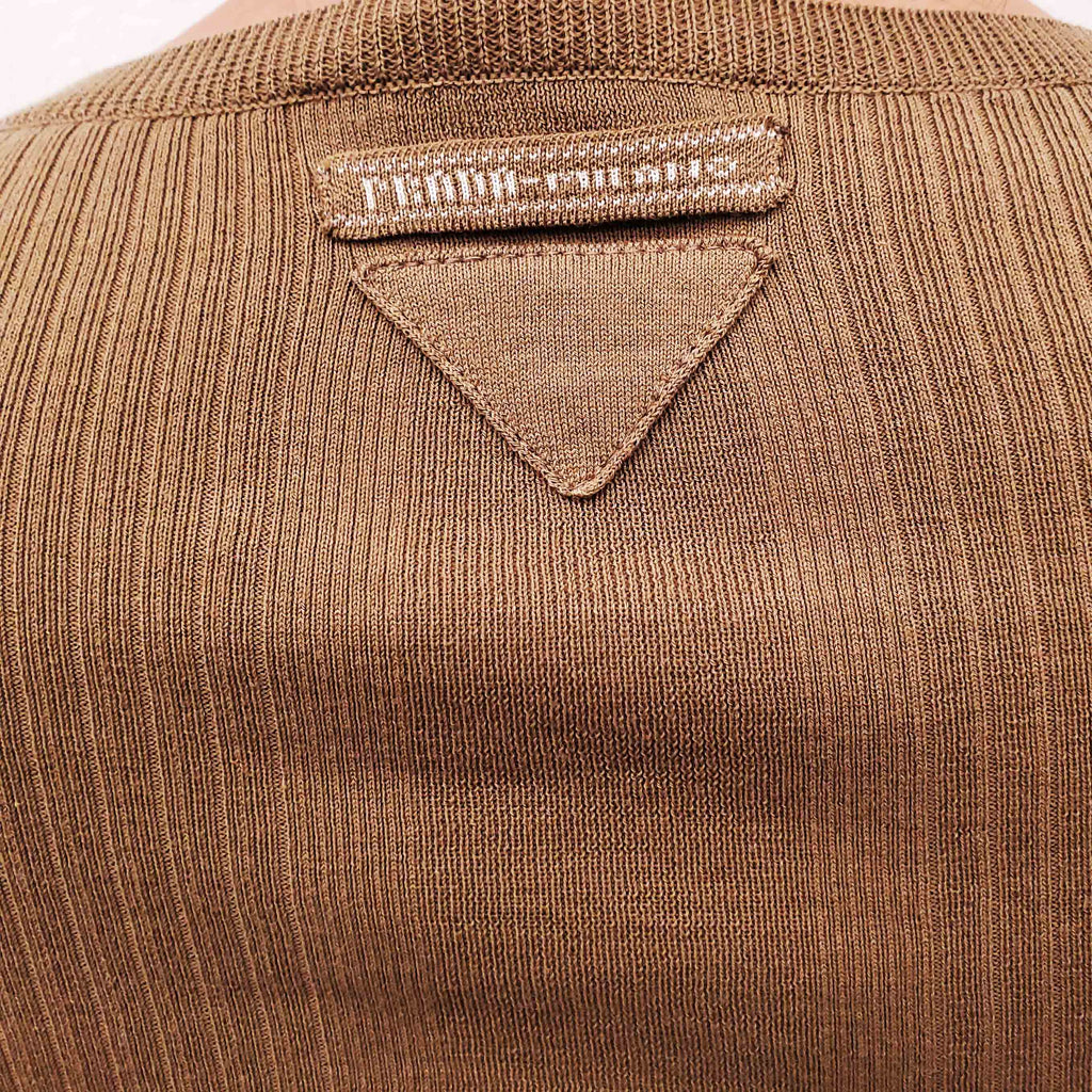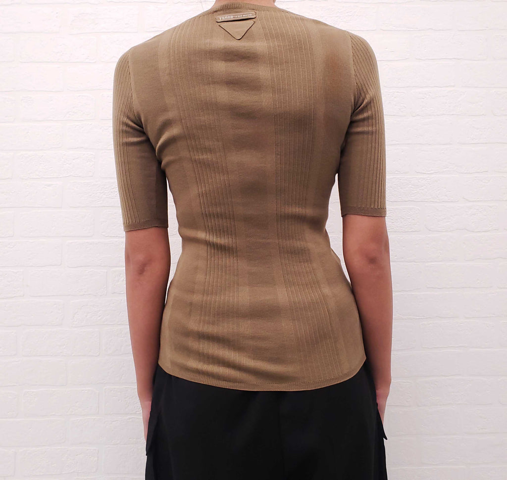 PRADA KHAKI SHORT SLEEVE KNIT TOP WITH LOGO DETAIL - SIZE 40