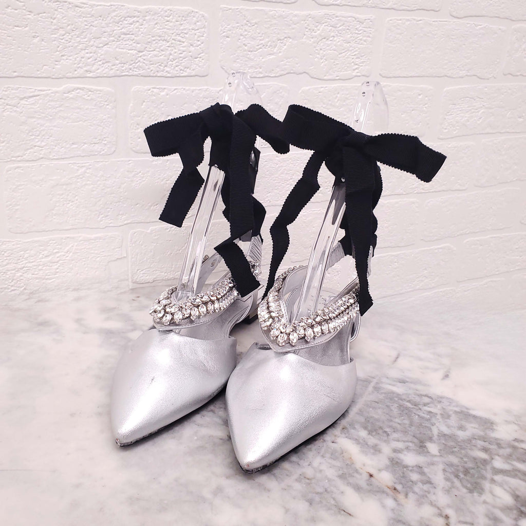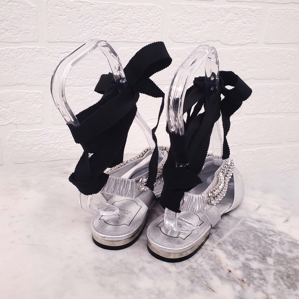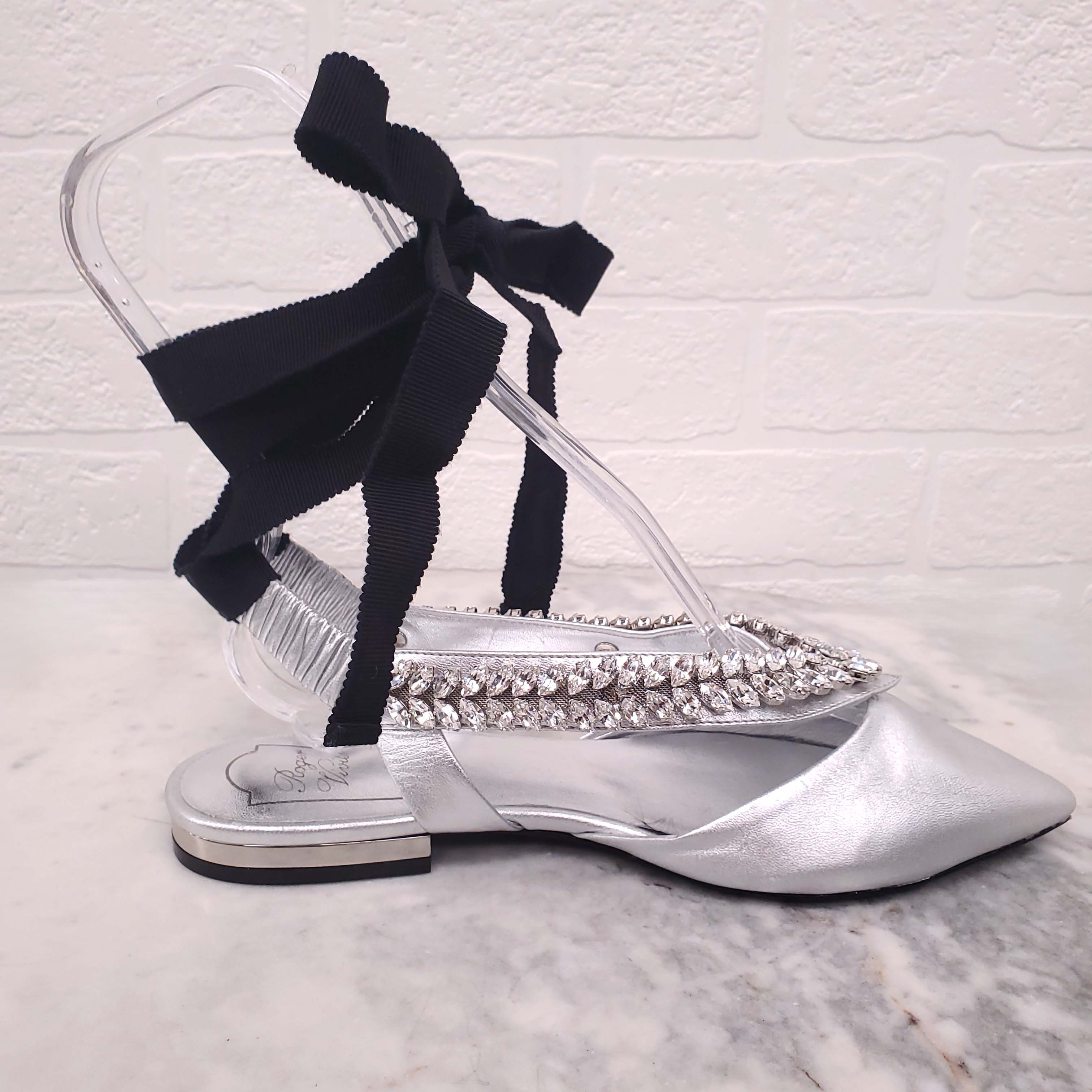 ROGER VIVIER V CRYSTAL-EMBELLISHED METALLIC LEATHER POIN-TOE FLATS - SIZE 36